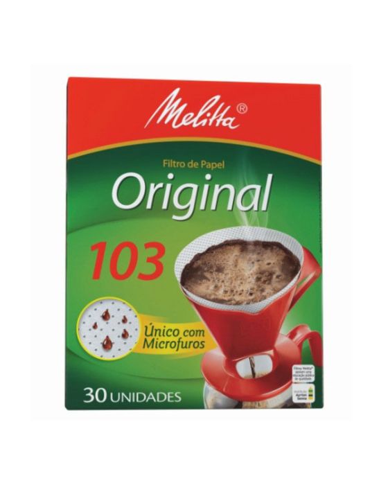 Caracteristicas:O Original Filtro Melitta® possui a exclusiva tecnologia de microfuros, esses furinhos no papel que têm o tamanho certo para deixar passar todo o aroma e sabor do seu café preferido. - Filtro de Papel para coar Café- Tamanhos: 103 (1000ml ou 20 xícaras)- Marca: Melita- Caixa com 30 unidades- Dimensões (A x L x P): 2,0 x 15,4 x 20,5cm- Peso Aproximado: 84,0 gramas* As especificações podem ser alteradas sem aviso prévio ** Imagem meramente ilustrativa.