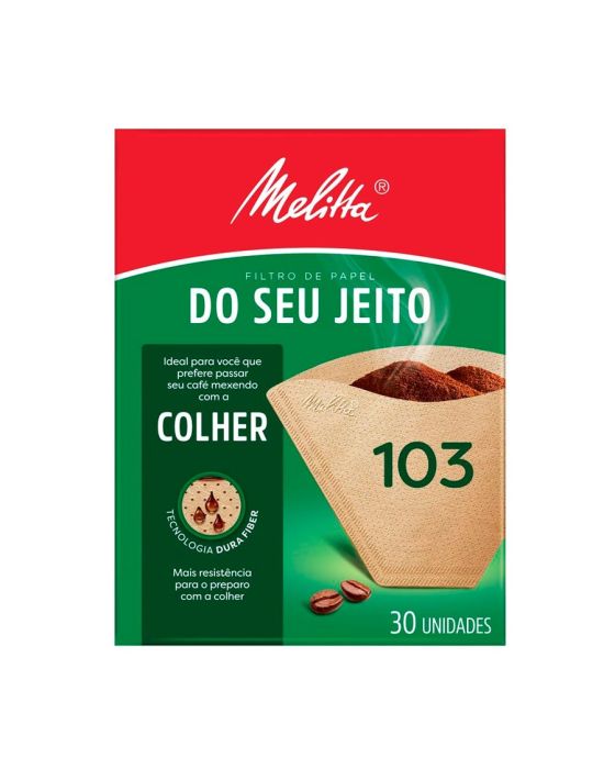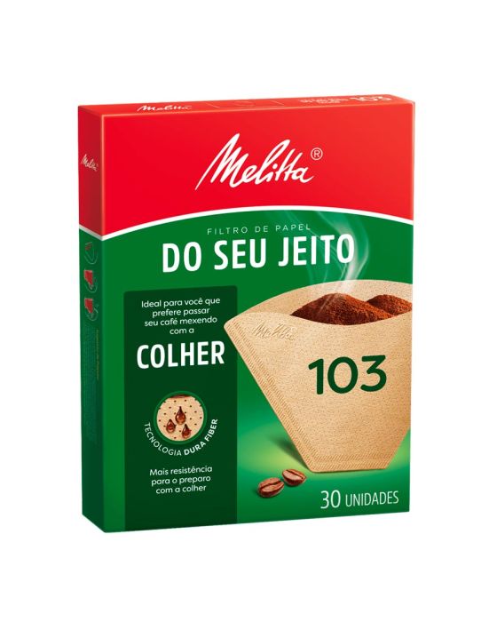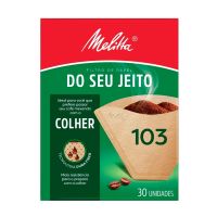 Caracteristicas:Pensando em você que prefere preparar seu café mexendo com a colher, os especialistas em preparo da Melitta® desenvolveram a tecnologia Dura Fiber. Com maior espessura e resistência, ajuda a impedir que o papel se rompa, passando seu café do jeitinho que você gosta.Detalhes:- Marca: Melitta®.- Modelo: Do seu Jeito - 103.- Linha: Filtro de papel para café.- Tipo: Colher.- Contém: 1 embalagem com 30 unidades- Tecnologia Dura Fiber.- Maior espessura e resistência, mesmo úmido.- Café fresquinho para sentir mais a vida.- Mais rresistência para o preparo com a colher.Ideal para:- O Filtro de papel para café Melitta® Colher 103 é ideal para quem prefere passar o café mexendo com a colher.Modo de usar:- Dobre o filtro de papel nas áreas indicadas e coloque-o no suporte para filtro 103 (Grande).- Para preparar 20 xícaras de café de 50ml, coloque 4 colheres de sopa bem cheias (equivalente a 80g) de pó no filtro.- Sempre segurando a alça do suporte para filtro, acrescente 1 litro de água mexendo com uma colher durante o processo, evitando o preparo diretamente sobre uma garrafa térmica.Produto com certificações: FSC® C014015 e FSC® C142450* As especificações podem ser alteradas sem aviso prévio ** Imagem meramente ilustrativa.