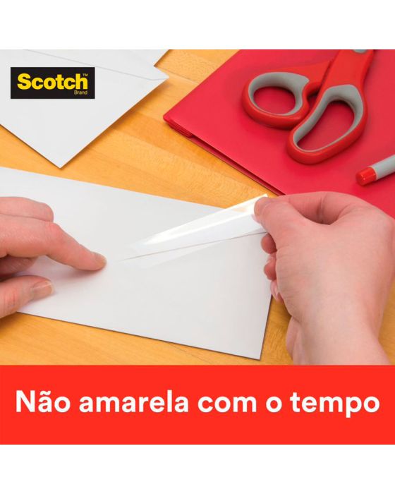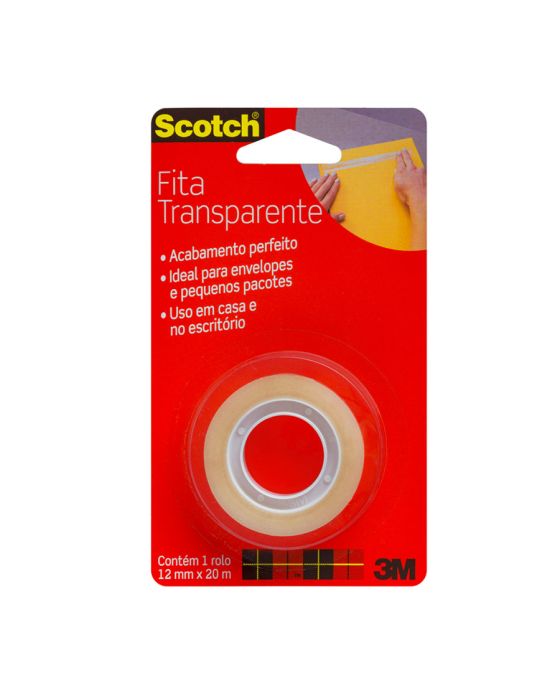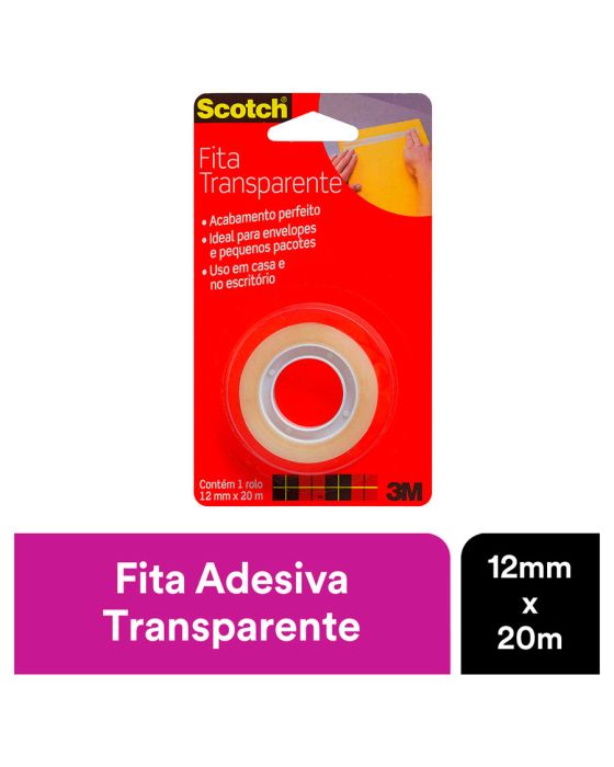 Características:A Fita Adesiva Scotch™ Transparente combina alta clareza com uma aplicação de longa duração. É a clássica fita com acabamento brilhante, sendo especialmente indicada para embrulhos em geral, vedação e reparos. É mais prática e rápida de colar, com maior adesão instantânea além de ser fácil de desenrolar e manusear, garantindo uma colagem forte e permanente. Pode ser facilmente cortada com as mãos, sem a necessidade de um aparelho de corte.Detalhes:- Marca: Scotch™;- Fabricante: 3M™;- Modelo: Fita Adesiva Scotch™ Transparente;- Referência: HB004570626;- Linha: Fitas adesivas;- Cor: Transparente;- Contém: 1 blister com 1 unidade do produto;- Tamanho: 12mm x 20m (1,2cm x 20m (LxC);- Maior adesão instantânea: mais prática e rápida de colar;- Fácil de desenrolar e manusear;- Garante uma colagem forte e permanente;- Com acabamento brilhante e adesivo de longa duração.Aplicações sugeridas:- Especialmente indicada para embrulhos em geral, vedação e reparos;- Pode ser utilizada em trabalhos escolares, colagens em plástico, emendas e reforços de pequenos itens.Composição:- Composição Dorso: Filme de polipropileno bi-orientado (BOPP)- Composição Adesivo: Acrílico base d’água.Medidas:- Dimensões da fita: 12mm x 20m (1,2cm x 20m (LxC).Conteúdo: 1 Fita Adesiva 12mm X 20m Transparente C/1 Rl Scotch 3m.* As especificações podem ser alteradas sem aviso prévio ** Imagem meramente ilustrativa.