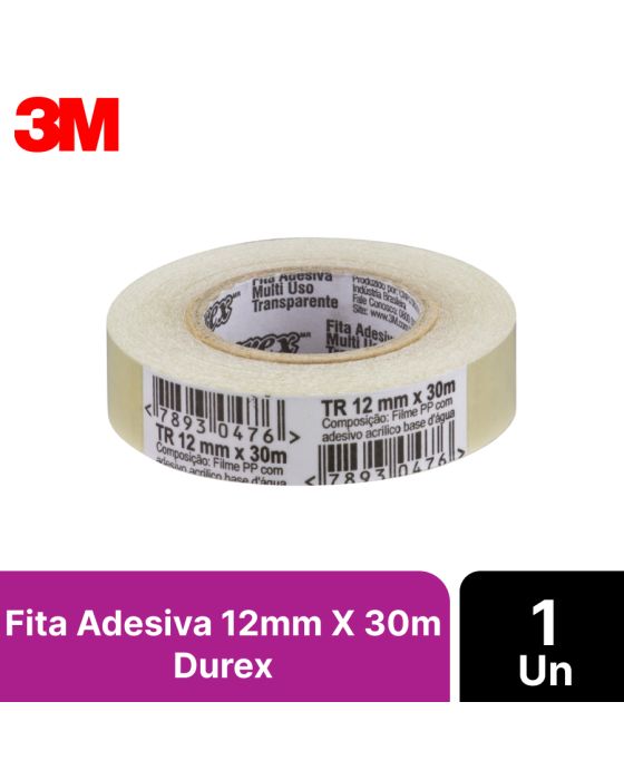 Características:A Fita Adesiva Transparente Durex™ é ideal para quem busca um produto versátil e não abre mão de um trabalho caprichado. Proporciona melhor acabamento, pois é transparente e não aparece nos pacotes.A Fita Adesiva Durex™ Transparente é ideal para quem busca um produto versátil e não abre mão de um trabalho caprichado. Proporciona melhor acabamento, pois é transparente e não aparece nos pacotes. A Fita DurexMR Transparente apresenta melhor acabamento e alta adesão. É mais prática e rápida de colar, com maior adesão instantânea. Pode ser utilizada em trabalhos escolares, colagem em plástico, emendas e reforços de pequenos itens. Ela ainda tem mais resistência à umidade e seu adesivo acrílico deixa a colagem mais rápida. A fita é resistente à umidade e possui desenrolamento leve. Pode ser facilmente cortada com as mãos, sem a necessidade de um aparelho de corte. Detalhes:- Marca: Durex™;- Fabricante: 3M™;- Modelo: Fita Adesiva Transparente Durex™;- Referência: HB004174262;- Linha: Fitas adesivas;- Cor: Transparente;- Contém: 1 unidade do produto;- Tamanho: 12mm x 30m (1,2cm x 30cm (LxC);- Maior adesão instantânea: mais prática e rápida de colar;- Desenrolamento leve;- Pode cortar facilmente com as mãos, sem a necessidade de um aparelho de corte.Aplicação Sugerida:- Proporciona melhor acabamento, pois é transparente e não aparece nos pacotes.Modo de uso:- Recomendamos que a aplicação da fita seja feita em condições próximas de 25 °C e umidade relativa de 50% em ambiente isento de contaminantes e/ou poeira;- Temperaturas muito baixas ou muito altas podem comprometer a performance da aplicação;- Para obtenção da melhor performance, recomendamos que testes prévios sejam feitos a fim de se confirmar todas as variações envolvidas no processo.Composição:- Composição da fita: Filme de polipropileno com adesivo acrílico a base d'água.Medidas:- Dimensões da fita: 12mm x 30cm (1,2cm x 30cm (LxC).Conteúdo da embalagem: 1 Fita Adesiva 12mm X 30m Transparente Durex 3m.* As especificações podem ser alteradas sem aviso prévio ** Imagem meramente ilustrativa.