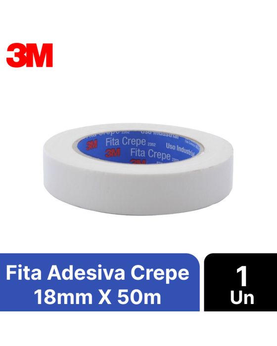 Características:A Fita Crepe para Uso Industrial 3M™ 2352 é indicada para mascaramento de pintura em geral, mascaramento de pintura/envernizamento residencial (portas, janelas, esquadrias, etc.) e proteções diversas que precisam de uma fita crepe. Também é usada para enfeixamento de peças leves, empacotamento leve, fixação de cartazes, trabalhos escolares e usos domésticos diversos. Apresenta dorso de papel crepe especialmente tratado e adesivo à base de resina e borracha. Isso oferece resistência adequada para a aplicação, maior conformabilidade, fácil desenrolamento e impermeabilidade a primers, tintas, solventes e umidade. Ela possui ainda boa adesão aos diferentes substratos e remoção fácil e limpa da superfície, sem deixar resíduos. Não deve ser utilizada para isolação elétrica e é recomendada para uso em até 80 °C e 40 minutos de exposição.Detalhes:- Marca: 3M™;- Fabricante: 3M™;- Modelo: Fita Crepe para Uso Industrial 3M™ 2352;- Referência: HB004193189;- Linha: Fitas Crepe;- Cor: Branca;- Uso: Profissional;- Contém: 1 unidade do produto;- Tamanho: 18mm x 50m (1,8cm x 50m);- Fita crepe para mascaramento de pinturas em geral;- Oferece resistência adequada para a aplicação e maior conformabilidade;- Fácil desenrolamento;- Impermeável a primers, tintas, solventes e umidade;- Pode ser removida de forma fácil e limpa, sem deixar resíduos nas superfícies;- Impermeáveis a primers, solventes, tintas, entre outros.Aplicações sugeridas:- Mascaramento de pintura/envernizamento residencial (portas, janelas, esquadrias, etc.);- Proteções diversas onde uma fita crepe é requerida;- Enfeixamento de peças leves, empacotamento leve, fixação de cartazes, trabalhos escolares, usos domésticos diversos, etc.Modo de usar:- A superfície deve estar seca, limpa e isenta de impurezas;- Desenrole a fita e fixe-a a superfície sem esticar, aplicando pressão com a mão, espátula e/ou rolete de borracha para garantir a adesão em toda a área e bom acabamento da linha de pintura;- Não deixar a fita aplicada por períodos superiores há 24 horas, para não haver transferência de adesivo;- Produto não recomendado para isolação elétrica.Composição:- Composição Dorso: Papel crepe tratado;- Composição Adesivo: Especial à base de resina e borracha.Precaução:- Esta fita não deve ficar exposta à intempéries;- Não recomendamos o uso para isolação elétrica;- Para uma boa adesão a fita deve ser pressionada sobre a superfície seca, isenta de pó, sujeira ou contaminantes;- Esta fita é recomendada para uso em até 80oC e 40 minutos de exposição;- Recomendamos que testes prévios sejam feitos a fim de se obter o melhor desempenho do produto na aplicação requerida.Medidas:- Dimensões da fita: 18mm x 50m (1,8cm x 50m) (LxC).Conteúdo: 1 Fita Adesiva Crepe 18mm X 50m 2352 3m.* As especificações podem ser alteradas sem aviso prévio ** Imagem meramente ilustrativa.
