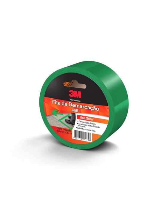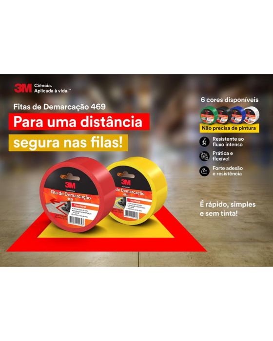 Caracteristicas:A Fita de Demarcação de Solo de Uso Geral 469 é a maneira mais prática e econômica de substituir o uso de tintas em aplicações de sinalização e demarcação em geral. Oferece grande visibilidade, boa resistência ao desgaste e fácil aplicação e remoção.- Resistente ao fluxo intenso de pessoas- Prática e flexível- Forte adesão e resistência- Boa resistência química- Boa resistência à abrasão- Resistência a temperaturas de até 76ºC- Vulnerável à ação de cetonas, hidrocarbonetos clorados e ésteres- Composição: Fita constituída de um dorso de PVC plastificado colorido coberto com adesivo a base de resina e borrachaAplicações sugeridas- Ideal para demarcar vagas, garagens, estacionamentos e organizar filas- Indicada para sinalizar portas de vidro e equipamentos de combate a incêndio- Também pode ser usada para marcação temporária de peças ou máquinas e proteção de peças, equipamentos ou produtos contra abrasãoCaracterísticas Técnicas- Espessura: 0,125 mm - Adesão ao aço: 450 gf/25mm- Resistência à tração: 5,25 kgf/25mm- Alongamento: 125%* As especificações podem ser alteradas sem aviso prévio ** Imagem meramente ilustrativa