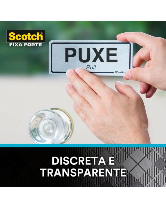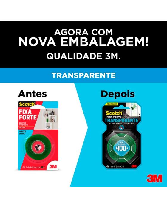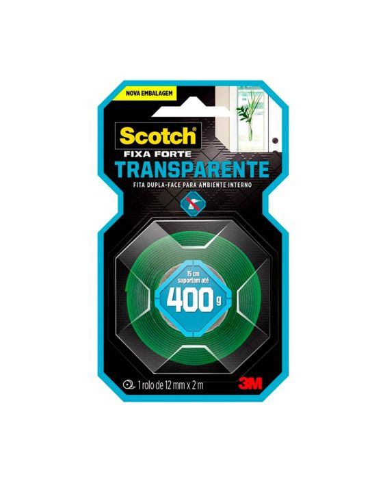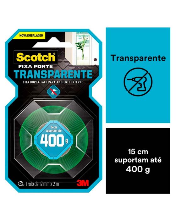 Características:A Fita Dupla Face 3M Scotch® Fixa Forte Transparente é a solução mais prática para fixar quadros, espelhos e peças de decoração. Por ser transparente, é ideal para fixar objetos em superfícies que exibam a fita aplicada, como vidro e acrílico. Sua aplicação é fácil, evitando furos e sujeira.Detalhes:- Marca: 3M;- Modelo: Fita Dupla Face 3M Scotch® Fixa Forte Transparente;- Referência: HB004419873;- Linha: Fitas dupla face;- Cor: Transparente;- Contém: 1 unidade do produto;- Tamanho: 12mm x 2m (Largura (Métrica) x Comprimento)- Excelente fixação: suportam até 400g;- Substitui pregos e parafusos;- Discreta e transparente;- Para ambientes internos;- Aplicação fácil, rápida e segura.Aplicações sugeridas:- Quadros, Espelhos e Objetos de decoração;- Uso iterno, não deve ser exposto ao sol.Modo de uso:- As superfícies devem estar limpas, secas e livres de gorduras (ceras, óleos etc);- Aplicar uma quantidade de fita especificada na embalagem;- Aplicar a fita numa das superfícies sem esticar, com pressão para garantir o contato e esperar no mínimo 20 minutos;- Remover o liner protetor e aplicar pressionando contra a outra superfície.Peso suportado:- Suporta 400g.Medidas:- Dimensões: 12mm x 2m (1,2cm x 2m).* Não recomendada para uso em papel de parede ou outras superfícies delicadas ou recém pintadas.* As especificações podem ser alteradas sem aviso prévio ** Imagem meramente ilustrativa