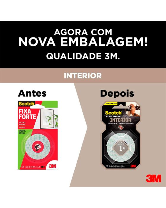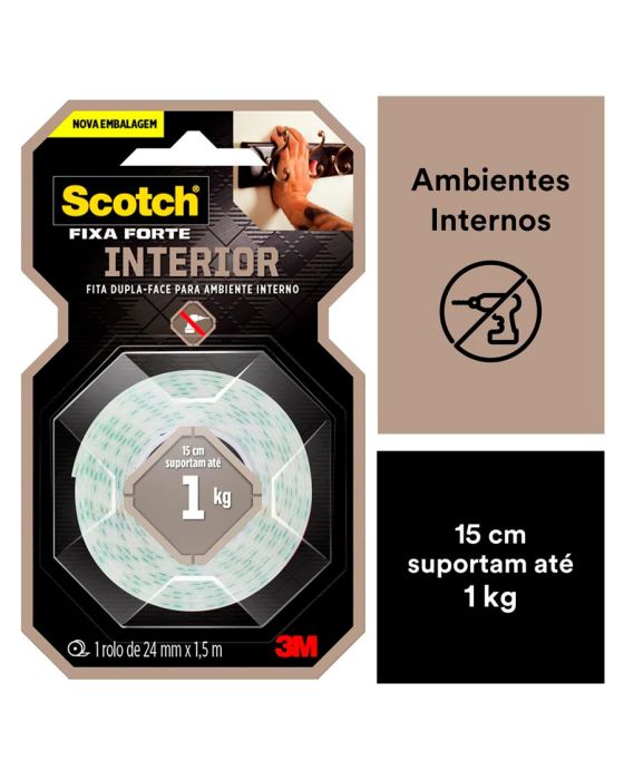 Características:A Fita Dupla Face 3M Scotch® Fixa Forte Interiores (Espuma) é a solução mais prática para fixar canaletas, porta-chaves, quadros, espelhos e peças de decoração, entre outros. Sua aplicação é fácil, evitando furos e sujeira.Detalhes:- Marca: 3M;- Modelo: Fita Dupla Face 3M Scotch® Fixa Forte Interiores;- Referência: HB004750186;- Linha: Fitas dupla face;- Cor: Branca;- Contém: 1 unidade do produto;- Excelente fixação: 15cm suportam até 1kg;- Substitui pregos e parafusos;- Para ambientes internos;- Indicados para objetos permanentes;- Não resiste a solventes e à intempéries;- Aplicação fácil, rápida e segura.Aplicações sugeridas:- Canaletas, Porta chaves, Quadros e Espelhos;- Uso interno.Modo de uso:- As superfícies devem estar limpas, secas e livres de gorduras (ceras, óleos etc);- Aplicar uma quantidade de fita especificada na embalagem;- Aplicar a fita numa das superfícies sem esticar, com pressão para garantir o contato e esperar no mínimo 20 minutos;- Remover o liner protetor e aplicar pressionando contra a outra superfície.Peso Suportado:- Cada 15cm de fita suporta 1kg.Composição:- Liner: Papel tratado com silicone xadrez;- Núcleo: Espuma de polietileno branca;- Adesivo: Acrílico Sintético à base d’água.Medidas:- Dimensões: 1,5cm x 24mm (1,5cm x 2,4cm) (CxL).* Não recomendada para uso em papel de parede ou outras superfícies delicadas ou recém pintadas.* As especificações podem ser alteradas sem aviso prévio ** Imagem meramente ilustrativa