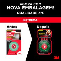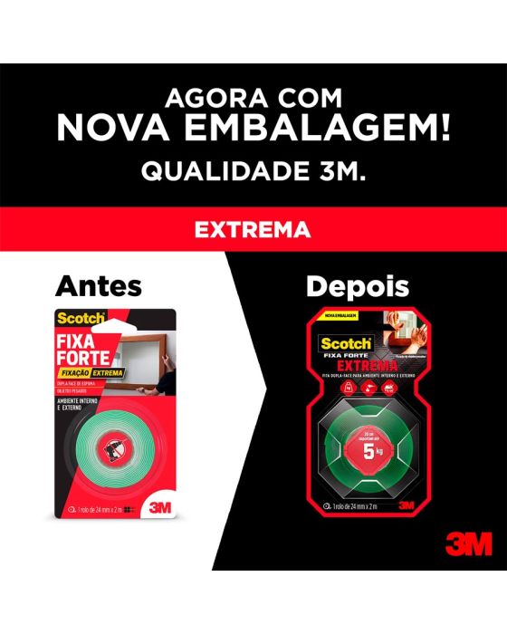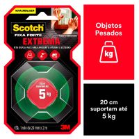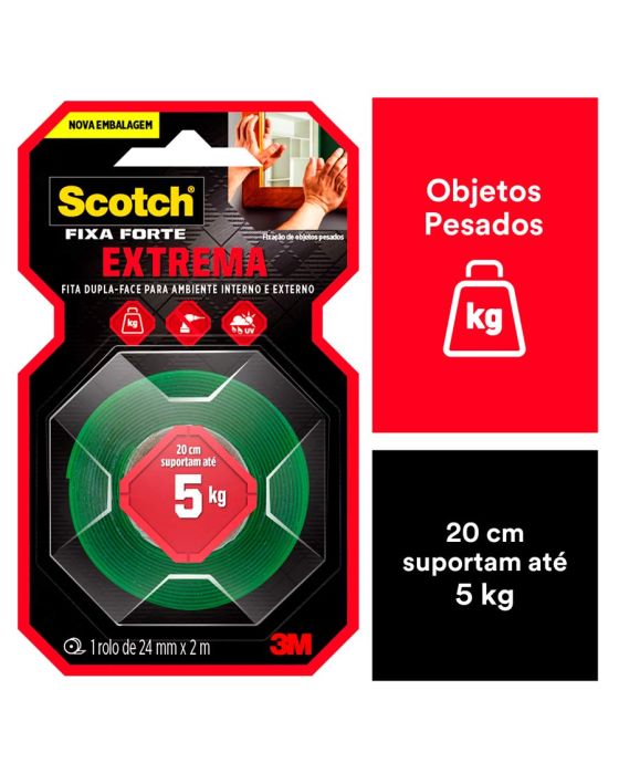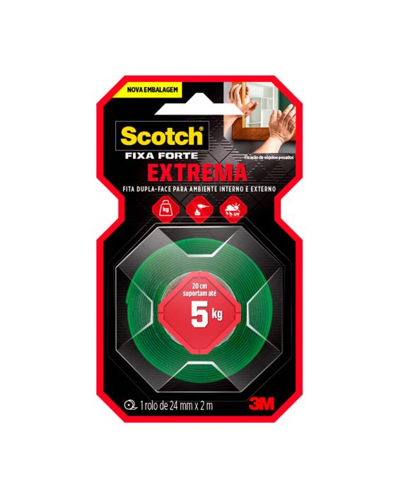 Características:A Fita Dupla Face 3M Scotch Fixa Forte Fixação Extrema é a solução mais prática para fixar objetos de decoração pesados como espelhos, quadros, painéis, lousas, entre outros. Sua aplicação é fácil, evitando furos e sujeira.O adesivo utilizado na fabricação desta fita é de alto desempenho e apresenta extraordinária força de fixação em aplicações de longa duração. A força de adesão e de coesão das fitas da família Fixa Forte são significativamente maiores do que das fitas adesivas convencionais.Detalhes:- Marca: Scotch;- Fabricante: 3M;- Modelo: Fita Dupla Face 3M Scotch Fixa Forte Fixação Extrema;- Referência: HB004492250;- Linha: Fitas adesivas;- Contém: 1 blister com 1 unidade do produto;- Tamanho: 24mm x 2m (2,4 x 2m (LxC);- Fixação Extrema: 20 cm suportam até 5 kg;- Substitui pregos e parafusos;- Para ambientes externos e internos;- Aplicação fácil, rápida e segura.Aplicações sugeridas:- Painéis;- Quadros grandes;- Espelhos;- Placas.Procedimento de Uso:- As superfícies devem estar limpas, secas e livres de gorduras (ceras, óleos etc).- Aplicar uma quantidade de fita especificada na embalagem.- Aplicar a fita numa das superfícies sem esticar, com pressão para garantir o contato e esperar no mínimo 20 minutos.- Remover o liner protetor e aplicar pressionando contra a outra superfície. Composição:- Composição Liner: Filme impresso de polietileno verde;- Composição Núcleo: Espuma acrílica Branca;- Composição Adesivo: Acrílico;Medidas:- Dimensões da fita: 24mm x 2m (2,4 x 2m (LxC).Conteúdo: 1 Fita Adesiva Dupla Face 24mm X 2m Fixa Forte Extrema Scotch 3m.* As especificações podem ser alteradas sem aviso prévio ** Imagem meramente ilustrativa.
