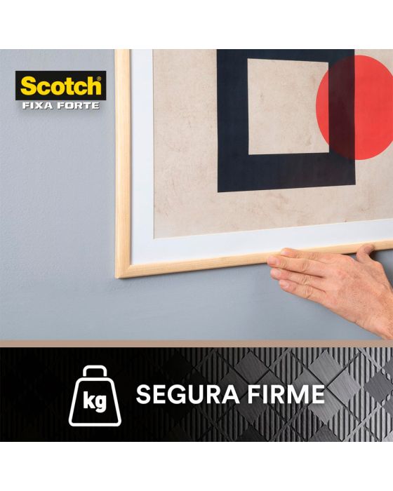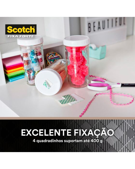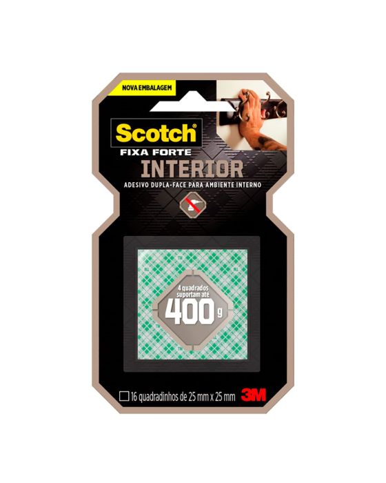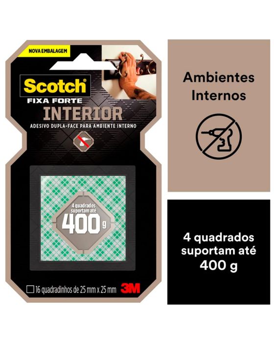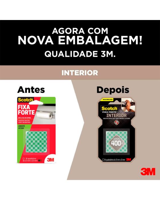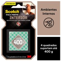 Características:A Fita Dupla Face 3M Scotch® Fixa Forte Interiores (Espuma) é a solução mais prática para fixar canaletas, porta-chaves, quadros, espelhos e peças de decoração, entre outros. Sua aplicação é fácil, evitando furos e sujeira.Detalhes:- Marca: 3M;- Modelo: Fita Dupla Face 3M Scotch® Fixa Forte Interiores;- Referência: H0002320036;- Linha: Fitas dupla face;- Cor: Branca;- Quantidade de adesivos: 16 quadradinhos;- Contém: 1 unidade do produto;- Tamanho: 25 x 25mm (Largura (Métrica) x Comprimento);- Excelente fixação: cada quadradinho suportam até 400g;- Substitui pregos e parafusos;- Para ambientes internos;- Indicados para objetos permanentes;- Não resiste a solventes e à intempéries;- Aplicação fácil, rápida e segura.Aplicações sugeridas:- Canaletas, Porta chaves, Quadros e Espelhos;- Uso interno.Modo de uso:- As superfícies devem estar limpas, secas e livres de gorduras (ceras, óleos etc);- Aplicar uma quantidade de fita especificada na embalagem;- Aplicar a fita numa das superfícies sem esticar, com pressão para garantir o contato e esperar no mínimo 20 minutos;- Remover o liner protetor e aplicar pressionando contra a outra superfície.Peso suportado:- Cada quadradinho de fita suporta 400g.Composição:- Liner: Papel tratado com silicone xadrez;- Núcleo: Espuma de polietileno branca;- Adesivo: Acrílico Sintético à base d’água.Medidas:- Dimensões: 25 x 25mm (25 x 25cm) (CxL).Atenção: A Fita Fixa Forte Espuma é ideal para uso em ambientes interno. Não resiste a solventes e à intempéries.* Não recomendada para uso em papel de parede ou outras superfícies delicadas ou recém pintadas.* As especificações podem ser alteradas sem aviso prévio ** Imagem meramente ilustrativa