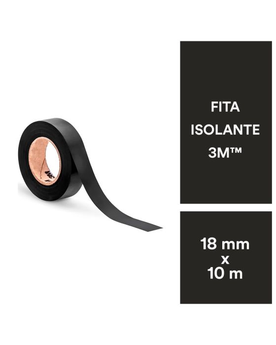 Caracteristicas:A Fita Isolante 3M™ é uma fita disponível em diversas cores que é especialmente construída para utilização nos mais variados tipos de isolação elétrica de fios, motores, painéis e outros dispositivos elétricos até 750 Volts. Com ótima conformabilidade às mais variadas superfícies, ela possui aplicação fácil e com ótimos resultados. É moldável e resiste ao desbotamento, além de proteger e isolar contra abrasão, água, gotas de solventes, produtos químicos e intempéries. Com boa durabilidade e aderência superior em todas as condições climáticas, esta fita facilitará o seu trabalho e diminuirá seus custos de manipulação. Com boa plasticidade e alongamento, a Fita Isolante 3M™ classe C garante economia de tempo e dos custos, promovendo o maior nível de proteção nos isolamentos. Ela também suporta variações de tensão e é superflexível, sem propagar fogo. Também pode ser utilizada para proteção mecânica de cabos de ferramentas.Detalhes:- Marca: 3M™;- Referência: HB004608095;- Linha: Fitas Isolantes;- Cor: Preta;- Contém: 1 unidade do produto;- Utilização em painés e dispositivos elétricos de até 750 volts;- Ótima conformabilidade;- Fácil aplicação e ótimos resultados, com economia de tempo e dos custos;- Maior nível de proteção nos isolamentos e suporte às variações de tensão;- Com espessura de 13 mm e classe de temperatura de 90 °C.Aplicação: - Especialmente construída para utilização nos mais variados tipos de isolação elétrica de fios, motores, painéis e outros dispositivos elétricos até 750 Volts.Modo se usar:- elimine qualquer resíduo de óleo ou graxa que houver sobre a área onde a fita será aplicada. - Procure cobrir a área a ser protegida sempre aplicando 50% da camada superior da fita sobre a inferior, fazendo assim uma sobreposição de material. - Mantenha-a esticada, exercendo leve pressão sobre o material já aplicado. - Cuidados: certifique-se de que as superfícies estejam limpas e isentas de contaminantes. Para proteção pessoal, cuidados especiais sempre devem ser tomados ao trabalhar com instalações ou equipamentos elétricos.Composição: - Filme de PVC com ação retardante de chama.Medidas:- Dimensões do produto: 18mm x 10m (1,8cm x 10m) (LxC).* As especificações podem ser alteradas sem aviso prévio ** Imagem meramente ilustrativa.