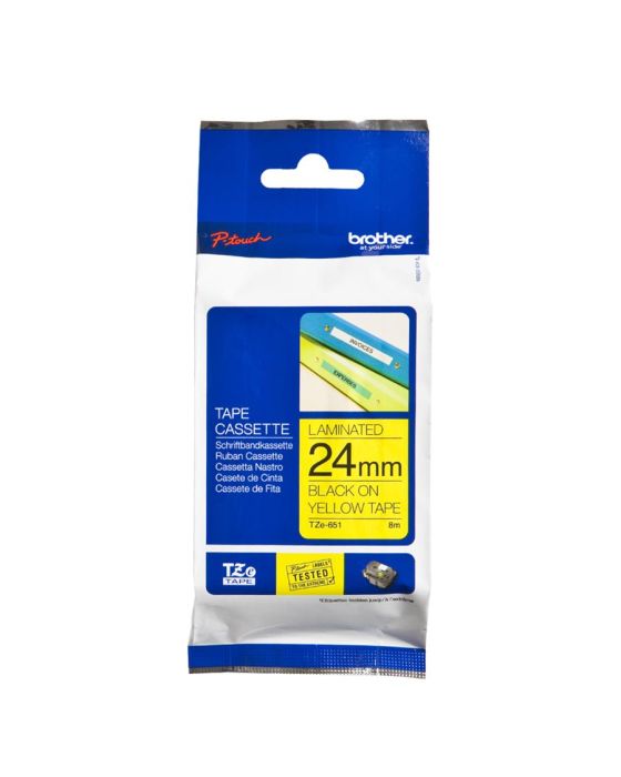 Características:A fita Brother TZE651 é indicado para uso em superfícies planas e lisas com alta aderência, ideal para destacar onde a etiqueta foi aplicada, conta com uma tecnologia única de laminação o que torna a fita durável e resistente que podem ser expostas a diferentes temperaturas e situações, permitindo que você crie etiquetas para diversos tipos de aplicação, seja para uso doméstico ou profissional!A linha TZE possui etiquetas laminadas, resistentes a temperaturas extremas, resistentes à água, abrasão e a produtos químicos, além de não desbotarem e possuírem uma película de proteção fácil de destacar.Detalhes:- Marca: Brother;- Modelo: TZE651;- Linha: Fita Rotuladora;- Família: Linha TZE;- Cor da fita: Amarelo;- Cor da escrita: Preto;- Tamanho: 24mm;- Contém: 1 unidade do produto;- Fita laminada;- Não desbota;- Possui alta aderência;- Durável;- Atóxica.Indicada para:- A TZE651 é indicada para uso em superfícies planas e lisas e possui alta aderência, é atóxica, fácil de manusear e não desbota, além de ser resistente a fatores como substâncias químicas, umidade, poeira, abrasão e temperaturas extremas.Compatibilidade:- Compatível com os modelos de rotuladores: PTE500VP, PTE550WVP, PTP700, PTP750W, PTP900W e PTP950NW.Resistência:- Temperaturas extremas (-80°C até +150°C);- A água, sol, umidade, substâncias químicas, abrasão, e poeira.Tipo de fita:- Laminada e ecológica.Medidas:- Largura: 24mm (2,4cm);- Comprimento: 8m.* As especificações podem ser alteradas sem aviso prévio ** Imagem meramente ilustrativa.