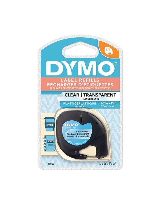 Características:Deixe tudo em ordem com Dymo!As fitas letratagforam criadas especificamente para o seu rotulador Letratag, elas fornecem uma solução econômica para rotular quase tudo, em qualquer lugar da sua casa.As fitas estão disponíveis nas versões: Papel, Plástico e para aplicações em tecidos. Detalhes: - Marca: Dymo.- Modelo: 16952.- Linha: Fita Rotuladora.- Cor da letra: Preta.- Cor da fita: Transparente.- Largura da fita: 1,2cm.- Comprimento: 4m.- Material: Poliéster.- Garantia: 3 meses.- Sistema pré corte easy peel, facilita a aplicação da etiqueta.- Fita auto-adesiva com impressão preta sobre a fita plástica transparente.- Forte poder de adesão desde que aplicada sobre superfície limpa e seca.- Material flexível e impermeável, com impressão térmica direta.Compatível com os modelos:- LT100H- LT100TPode ser utilizada para identificação de:- cadernos, pastas, armários, livros, ferramentas, quadro de força, remédio, material de limpeza, albúns fotográficos, vídeos, cds, arquivos, crachás, disquetes, cabos, telefones, prateleiras e onde mais você precisar.Atenção: A fita plástica deve ser usada longe do calor excessivo e evitar exposição direta do sol!!* As especificações podem ser alteradas sem aviso prévio ** Imagem meramente ilustrativa