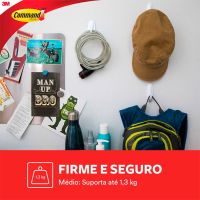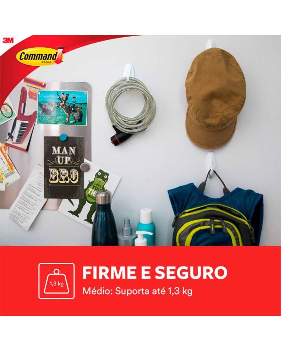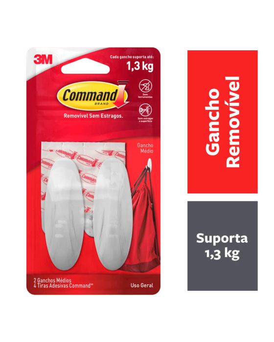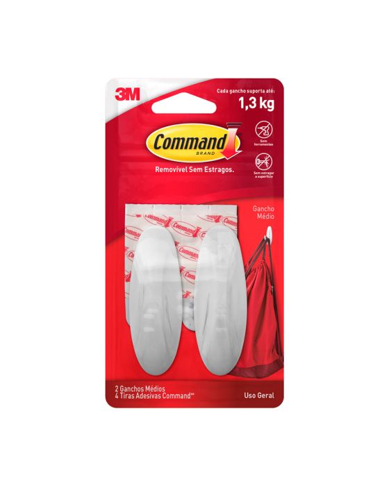 Características:O Gancho Adesivo Design 3M™ Command® é a solução ideal para organizar sua casa e escritório do seu jeito, de forma prática, sem sujeira e sem furos na parede. Faça você mesmo em minutos e remova quando quiser, sem estragar sua parede.Aplicação forte, remoção limpa, resultados sem danos na parede Sem deixar resíduos e sujeira, o Gancho Adesivo Plástico 3M Command™ Design pode ser aplicado em várias superfícies. Com cores e tamanhos diferentes, ele garante estilo para sua decoração. É fácil de ser colocado em diversas superfícies, como paredes pintadas, vidros, azulejos, madeira e metal.Detalhes:- Marca: Command™;- Fabricante: 3M™;- Referência: H0002040873;- Cor: Branco;- Tamanho: Médio;- Contém: 2 Ganchos Pequenos e 4 Tiras Adesivas;- Suporta até: Cada gancho suporta até 1,3kg;- Podem ser utilizados em áreas úmidas e diversas outras superfícies;- Sem ferramentas, Fácil de aplicar e remover;- Removível sem estragos, Ao ser removido não deixa adesivo nem danifica a parede.Modo de uso: - Como usar: Para aplicar estes ganchos de parede, limpe a parede com álcool e um pano seco;- Não use produtos de limpeza, aerossóis ou toalhinhas de limpeza, pois elas deixam um resíduo escorregadio que impede a aderência;- Separe as tiras e remova o recobrimento do adesivo;- Pressione a tira sobre a parte posterior do gancho;- Agora, pressione o gancho firmemente contra a parede ou superfície durante mais ou menos 30 segundos;- Quanto maior for a pressão, mais forte será a adesão;- Para que realmente exista uma aderência, você tem que deslizar o gancho para cima, fora da base de montagem;- Espere 1 hora antes de pendurar algum artigo;- Para remover, empurre para cima a parte inferior do gancho para deixar a base à vista na parede;- Segure a base com cuidado, não a pressione contra a parede;- Lembre-se de que você nunca deve puxar a tira em sua direção, sempre puxe para baixo o mais devagar que você puder;- Pressione com o polegar a tira grudada na parede e com a outra mão puxe lentamente para baixo mantendo-a esticada aproximadamente 30 cm ou até que esta desgrude da superfície.Composição:- Liner: Papel;- Gancho: Poliestireno de alto impacto;- Filme: Fita de Polietileno;- Adesivo: Borracha.Recomendação:- Apesar de seu alto poder de adesão à maioria das superfícies lisas e de ser fabricado sob rigoroso controle de qualidade, o adesivo Command pode não aderir a algumas superfícies. Por este motivo não recomendamos sua utlização com objetos valiosos ou insubstituíveis;- Para sua total segurança não utilize os produtos Command para fixação de objetos sobre cabeceiras de camas;- Não aplique os produtos Command sobre papel de parede, pois, pode não aderir em alguns papéis de parede de vinil;- A utilização de dois ou mais ganchos simultaneamente não garante a sustentação da soma do peso máximo especificado na cartela;- Não aplique em superfícies expostas diretamente à luz solar;- Não aplique sobre tinta fresca;- Não aplique em superfícies irregulares, muito texturizadas ou que absorvam umidade. Conteúdo da embalagem: 2 Ganchos médios Command™ e 4 tiras adesivas.* As especificações podem ser alteradas sem aviso prévio ** Imagem meramente ilustrativa.