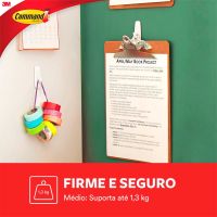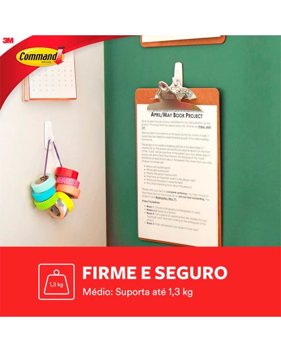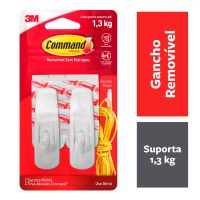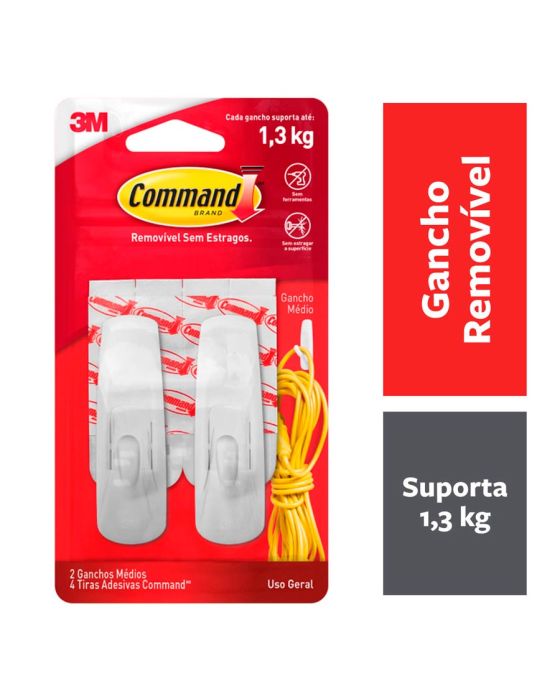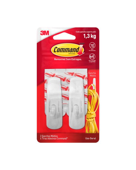 Características:O Gancho Adesivo 3M™ Command® é a solução ideal para organizar sua casa e escritório do seu jeito, de forma prática, sem sujeira e sem furos na parede. Faça você mesmo em minutos e remova quando quiser, sem estragar sua parede e podendo ser aplicado em várias superfícies. Cada embalagem contém um gancho plástico branco grande e dois adesivos grandes, sendo que cada gancho suporta até 1,3kg. Esqueça os pregos, parafusos e tachas: esses ganchos adesivos são rápidos e fáceis de pendurar, podem ser utilizados em diversas superfícies e são removidos de forma limpa sempre que você desejar.Detalhes:- Marca: Command™;- Fabricante: 3M™;- Referência: H0001818113;- Linha: Ganchos Adesivos;- Cor: Branco;- Tamanho: Médio;- Contém: 2 Ganchos Médios e 4 Tiras Adesivas;- Suporta até: Cada gancho suporta até 1,3kg;- Sem ferramentas, Fácil de aplicar e remover;- Removível sem estragos, Ao ser removido não deixa adesivo nem danifica a parede;- Firme e seguro.Modo de uso:- Como usar: Para aplicar estes ganchos de parede, limpe a parede com álcool e um pano seco;- Não use produtos de limpeza, aerossóis ou toalhinhas de limpeza, pois elas deixam um resíduo escorregadio que impede a aderência;- Separe as tiras e remova o recobrimento do adesivo;- Pressione a tira sobre a parte posterior do gancho;- Agora, pressione o gancho firmemente contra a parede ou superfície durante mais ou menos 30 segundos;- Quanto maior for a pressão, mais forte será a adesão;- Para que realmente exista uma aderência, você tem que deslizar o gancho para cima, fora da base de montagem;- Espere 1 hora antes de pendurar algum artigo;- Para remover, empurre para cima a parte inferior do gancho para deixar a base à vista na parede;- Segure a base com cuidado, não a pressione contra a parede;- Lembre-se de que você nunca deve puxar a tira em sua direção, sempre puxe para baixo o mais devagar que você puder;- Pressione com o polegar a tira grudada na parede e com a outra mão puxe lentamente para baixo mantendo-a esticada aproximadamente 30 cm ou até que esta desgrude da superfície.Composição:- Liner: Papel;- Gancho: Poliestireno de alto impacto;- Filme: Fita de Polietileno;- Adesivo: Borracha.Recomendação:- Apesar de seu alto poder de adesão à maioria das superfícies lisas e de ser fabricado sob rigoroso controle de qualidade, o adesivo Command pode não aderir a algumas superfícies. Por este motivo não recomendamos sua utlização com objetos valiosos ou insubstituíveis;- Para sua total segurança não utilize os produtos Command para fixação de objetos sobre cabeceiras de camas;- Não aplique os produtos Command sobre papel de parede, pois, pode não aderir em alguns papéis de parede de vinil;- A utilização de dois ou mais ganchos simultaneamente não garante a sustentação da soma do peso máximo especificado na cartela;- Não aplique em superfícies expostas diretamente à luz solar;- Não aplique sobre tinta fresca;- Não aplique em superfícies irregulares, muito texturizadas ou que absorvam umidade.Conteúdo da embalagem: 2 Ganchos Médios Command™ e 4 tiras adesivas.* As especificações podem ser alteradas sem aviso prévio ** Imagem meramente ilustrativa.