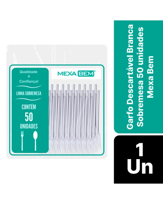 Características:O Garfo de sobremesa Linha Leve Mexa Bem é a opção ideal para o momento do almoço, fabricado em poliestireno cristal, é um produto ideal para escritórios, copas, salas de reunião, restaurantes, lanchonetes e padarias.Detalhes:- Marca: Mexa Bem;- Modelo: Linha Leve;- Linha: Talheres;- Tipo: Garfo para sobremesa;- Cor: Branco;- Tamanho: 12,5cm;- Quantidade: 50 unidades;- Contém: 1 unidade com 50 unidades;- Ponta arredondada;- Possui serrinha;- Refeições práticas e leves;- Qualidade e Confiança;- Material atóxico;- Produto descartável;- Produto com 100% de matéria prima e pigmentos virgens.Indústria Brasileira | Validade Indeterminada.Ideal para:- Ideal para uso em escritórios, salas de reuniões, copa, restaurantes, lanchonetes, cafeterias e demais ambientes corporativos.Recomendações:- A princípio mantenha o produto em sua embalagem original, ao abrigo de luz e bem fechada após o uso;- Além disso não reutilize a embalagem vazia para outros fins;- Após o uso, descarte o garfo de maneira adequada em um recipiente de lixo.Composição:- Poliestireno cristal e pigmentos atóxicos.Medidas:- Dimensões do produto: 12,5 x 2 x 1cm (CxLxA);- Dimensões da embalagem: 19,5 x 14,7 x 3cm (CxLxA);- Peso: 59g.ATENÇÃO! CONSERVE FORA DO ALCANCE DAS CRIANÇAS E DOS ANIMAIS DOMÉSTICOS.* As especificações podem ser alteradas sem aviso prévio** Imagem meramente ilustrativa.