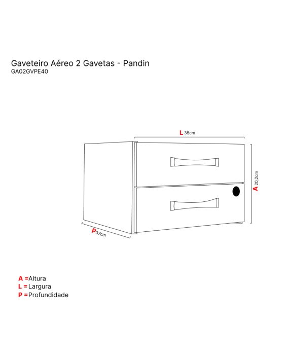 Características:A linha PE40 Pandin é ideal para desempenhar tarefas diárias de trabalho armazenando pastas suspensas tamanho oficio, ele oferece espaço para você e deixa o seu local de trabalho muito mais organizado e elegante.Detalhes:- Marca: Pandin.- Modelo: GA02GVPE40.- Linha: Gaveteiro Aéreo.- Cor: Walnut/Preto.- Gavetas: 2 Gavetas.- Material: MDP 15mm.- Tipo de puxador: Externo.- Fechadura: Tipo Yale, com duas chaves e fechamento simultâneo das gavetas.Onde usar:- Escritórios: Organização de materiais de escritório, livros, pastas e documentos.- Home Office: Organização de livros, pastas e documentos.Medidas:- Largura: 35cm.- Altura: 20,2cm.- Profundidade: 37cm.- Peso: 4kg.Acabamento- Acabamento em fita em PVC (Poliestireno) com 0,45mm espessura com bordas aparentes encabeçadas.Capacidade - Capacidade de peso: Suporta até 15kg por gaveta.Instruções de limpeza:- Passar um pano levemente umedecido com água e/ou detergente neutro e em seguida um pano seco para as limpezas do dia a dia.*Produto enviado desmontado.Manual em vídeo para montagem: https://www.youtube.com/watch?v=qL4a6pBvHiw* As especificações podem ser alteradas sem aviso prévio ** Imagem meramente ilustrativa.