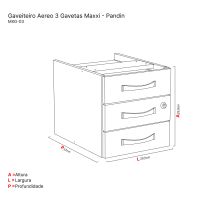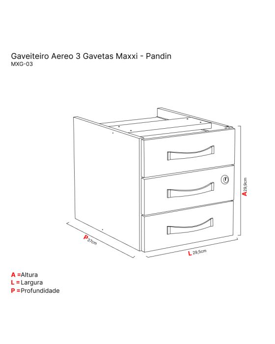 Características:A linha Maxxi Pandin é ideal para desempenhar tarefas diárias de trabalho armazenando pastas suspensas tamanho oficio, ele oferece espaço para você e deixa o seu local de trabalho muito mais organizado e elegante.Detalhes:- Marca: Pandin.- Modelo: MAXXI MXG-03.- Linha: Gaveteiro Aéreo.- Cor: Cinza.- Gavetas: 3 Gavetas.- Material: MDP 15mm.- Fechadura: Tipo Yale, com duas chaves e fechamento simultâneo das gavetas.- Desliza sobre guias internas em madeira.- Puxador sobrepor na cor prata.Onde usar:- Escritórios: Organização de materiais de escritório, livros, pastas e documentos.- Home Office: Organização de livros, pastas e documentos.Medidas:- Largura: 29,5cm.- Altura: 29,9cm.- Profundidade: 37cm.Acabamento- Acabamento em fita em PVC (Poliestireno) com 0,45mm espessura com bordas aparentes encabeçadas.Capacidade - Capacidade de peso: Suporta até 15kg por gaveta.Instruções de limpeza:- Passar um pano levemente umedecido com água e/ou detergente neutro e em seguida um oano seco para as limpezas do dia a dia.*Produto enviado desmontado.Manual em vídeo para montagem: https://www.youtube.com/watch?v=qL4a6pBvHiw* As especificações podem ser alteradas sem aviso prévio ** Imagem meramente ilustrativa.