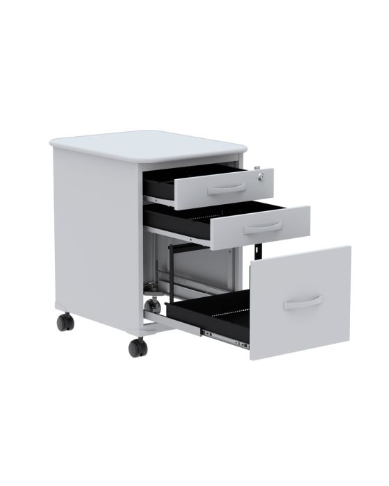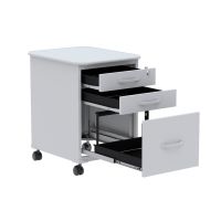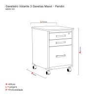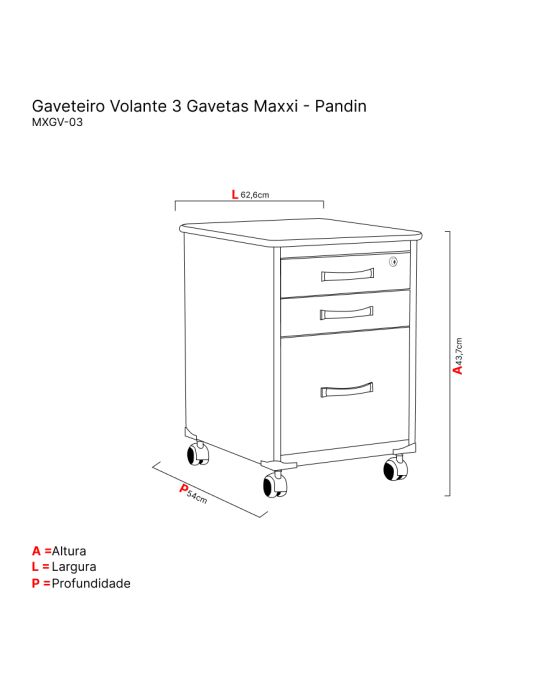 Características:A linha PE40 Pandin é ideal para desempenhar tarefas diárias de trabalho armazenando pastas suspensas tamanho oficio, ele oferece espaço para você e deixa o seu local de trabalho muito mais organizado e elegante.Detalhes:- Marca: Pandin.- Modelo: MAXXI GVPS03GVMX.- Linha: Gaveteiro Volante.- Cor: Cinza.- Gavetas: 3 Gavetas.- Fechadura: Tipo Yale, com duas chaves e fechamento somente da primeira gaveta.- Gavetas Deslizam por Corrediças de aço e roldanas de nylon.- Com 4 rodízios sendo 2 dianteiros com trava.- Puxador na cor cinza.- Abertura das gavetas 32cm, 16cm e 6cm.Onde usar:- Escritórios: Organização de materiais de escritório, livros, pastas e documentos.- Home Office: Organização de livros, pastas e documentos.Medidas:- Dimensões Totais: 62,6 x 43,7 x 54cm (LxAxP). - Dimensões primeira e segunda gaveta: 36,5 x 9cm (CxA).- Dimensões terceira gaveta: 36,5 x 28,2cm.- Dimensões tampo: 43,7mm x 54 x 1,5cm (LxPxE).Material:- Corpo: Fabricado em aço tratado pelo processo anticorrosivo, sua parte traseira tem 1 reforço, corpo do produto possui 2 reforços de 1,20mm com chapa #18 e 2 reforços (1 tipo Z na parte dianteira e 2 de cada lado tipo ômega em chapa #26 com 0,45mm).- Estrutura interna gavetas: Fabricado em aço, possui duas dobras nas laterais sendo: 1° dobra 10mm e a 2° dobra com 5mm ambas à 90°, traseira com 1 dobra perpendicular com 5mm à 90°.- Estrutura tampo e frente gavetas: Confeccionada em MDP MP (Partículas de média densidade) revestido por uma folha celulósica decorativa banhada em solução melamínica fixada através de um processo de prensa de baixa pressão com acabamento em fita ABS de 0,45mm de espessura.- Estrutura trilhos: O deslizamento sobre roldanas de nylon, possui um trilho em chapa #18 de 1,20mm e uma canaleta para sustentar a gaveta em chapa #16 de 1,50mm.- Base: Rodízios em polipropileno de alto impacto.Capacidade:- Capacidade de peso: Suporta até 10kg por gaveta.Instruções de limpeza:- Passar um pano levemente umedecido com água e/ou detergente neutro e em seguida um pano seco para as limpezas do dia a dia.*Produto enviado desmontado.Manual em vídeo para montagem: https://www.youtube.com/watch?v=qL4a6pBvHiw* As especificações podem ser alteradas sem aviso prévio ** Imagem meramente ilustrativa.