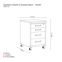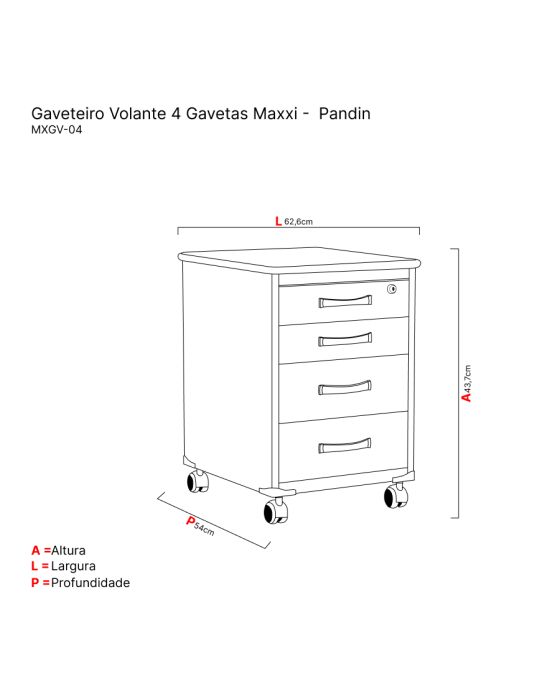 Características:A linha PE40 Pandin é ideal para desempenhar tarefas diárias de trabalho armazenando pastas suspensas tamanho oficio, ele oferece espaço para você e deixa o seu local de trabalho muito mais organizado e elegante.Detalhes:- Marca: Pandin.- Modelo: MAXXI MXG-04.- Linha: Gaveteiro Aéreo.- Cor: Cinza.- Gavetas: 4 Gavetas.- Material: MDP 15mm.- Fechadura cilíndrica tipo Yale com fechamento simultâneo de todas as gavetas.- Gavetas Deslizam por Corrediças de aço e roldanas de nylon.- Puxador em PVC na cor cinza.- Abertura das gavetas 32cm, 16cm e 6cm.- Acompanha 4 rodízios sendo 2 sem travamento e 2 frontais com travamento, confeccionados em poliestireno podendo ser nas cor preta.Onde usar:- Escritórios: Organização de materiais de escritório, livros, pastas e documentos.- Home Office: Organização de livros, pastas e documentos.Medidas:- Largura: 62,6cm.- Altura: 43,7cm.- Profundidade: 54cm.Acabamento- Acabamento em perfil de ABS 180°.Capacidade - Capacidade de peso: Suporta até 10kg por gaveta.Instruções de limpeza:- Passar um pano levemente umedecido com água e/ou detergente neutro e em seguida um oano seco para as limpezas do dia a dia.*Produto enviado desmontado.Manual em vídeo para montagem: https://www.youtube.com/watch?v=qL4a6pBvHiw* As especificações podem ser alteradas sem aviso prévio ** Imagem meramente ilustrativa.