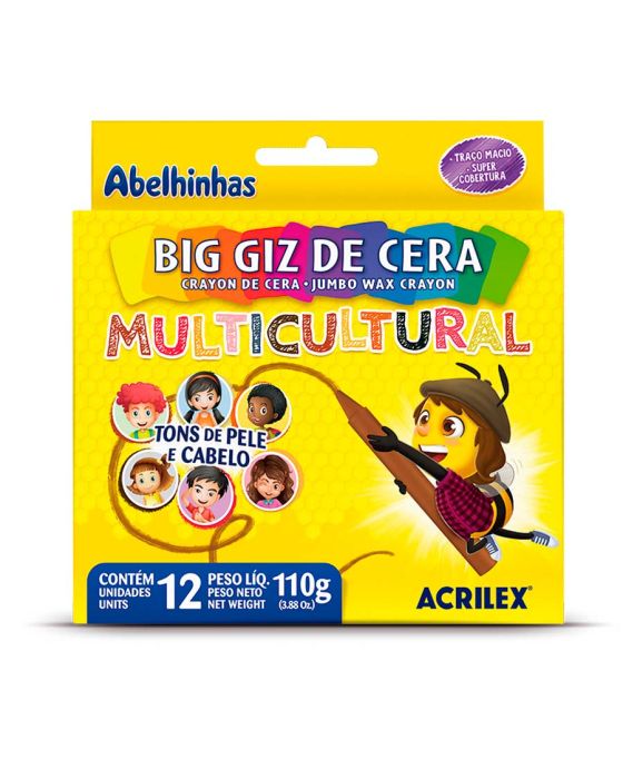 Caracteristicas:O Big Giz de Cera Multicultural é ideal para crianças pequenas devido ao seu tamanho maior, facilita a pega e auxilia o desenvolvimento da coordenação motora fina.Detalhes:- Marca: Acrilex.- Modelo: Multicultural.- Referência: 09122.- Linha: Giz de cera.- Cores: Cinza, Preto, Chocolate, Castanho Claro, Salmão Bebê Areia, Amarelo Limão, Laranja, Vermelho, Caramelo, Telha e Branco.- Contém: 1 unidade do produto com 12 cores mistas.- Peso Líquido: 110g.- Fabricado com ceras de alta qualidade.- Tem formato redondo, fabricado com ceras de qualidade.- Traços macios.- Super cobertura.- Não tóxico.- Não mancha as mãos- Rótulos individuais com nome da cor.Aplicação:- Ideal para uso na pré-escola e em trabalhos escolares diversos.* As especificações podem ser alteradas sem aviso prévio ** Imagem meramente ilustrativa.