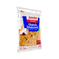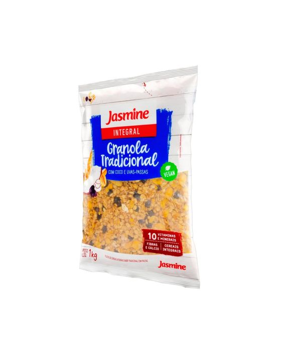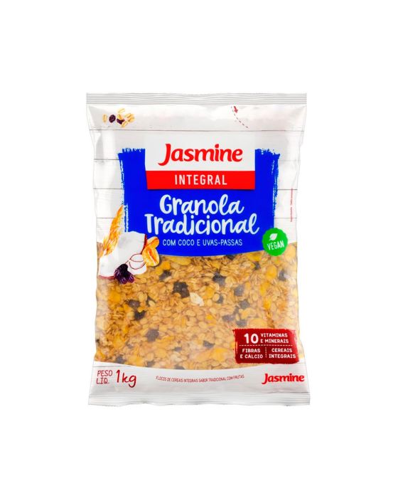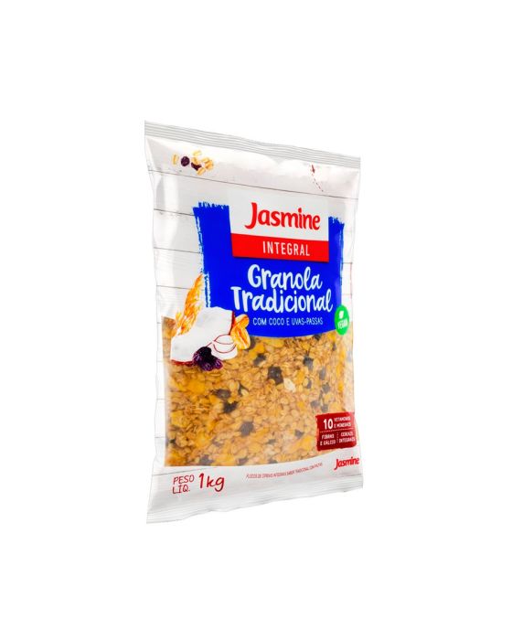 Caracteristicas:A Granola Cereais Tradicional Jasmine é a combinação ideal para um café da manhã repleto de cuidado e carinho. Porque de vida saudável a gente entende!Detalhes:- Marca: Jasmine.- Modelo: Granola Cereais Tradicional.- Linha: Integral.- Peso: 1kg.- Ingredientes: Flocos de aveia integral, flocos de milho integral, uva-passa, óleos vegetais (milho e ou girassol e ou algodão), melado de cana, flocos de cereais, açúcar mascavo, fibra de trigo, extrato de malte, coco, mix de vitaminas e minerais (cálcio, vitaminas C, B3, E, Zinco, vitaminas B2, B6, B1, B5, A e D), gergelim e aroma.- Com coco e castanha-do-Pará.- Produto vegano.- Embalagem Econômica.- Baixo teor de gorduras saturadas- 0% gordura trans- Possui 11 vitaminas e minerais.- fonte de fibras e cereis integrais.- Contém: 1 embalagem com 1kg.Industria Brasileira.Modo de conservação:- Após aberto, mantenha o pacote vedado para conservar o sabor e a crocância.- Conservar em local seco e arejado.* ALÉRGICOS: CONTÉM AVEIA E DERIVADOS DE TRIGO E DE CEVADA. PODE CONTER CENTEIO, AMÊNDOA, AMENDOIM, CASTANHA-DE-CAJU, CASTANHA-DO-PARÁ, AVELÃ, MACADÂMIA, NOZ, PECÃ, PISTACHE, PINOLI, CASTANHAS E SOJA.** CONTÉM GLÚTEN. O GLÚTEN É PREJUDICIAL Á SAÚDE DOS DOENTES CELÍACOS.* As especificações podem ser alteradas sem aviso prévio ** Imagem meramente ilustrativa.