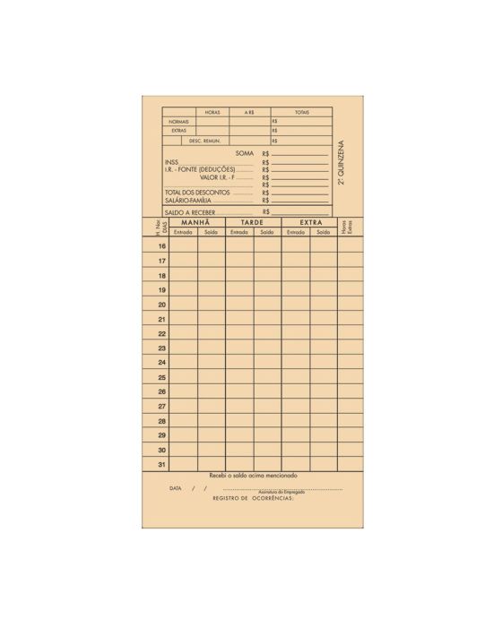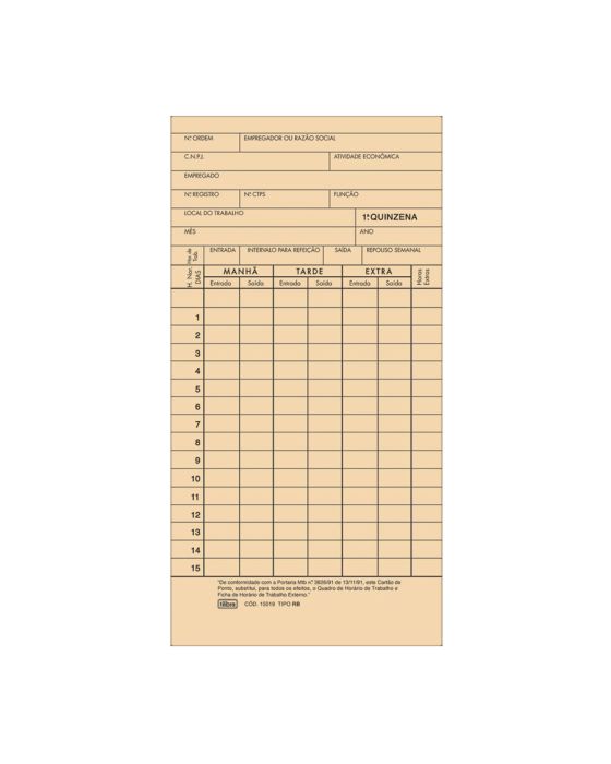 Características:O Cartao de Ponto Mensal RB com 100 Folhas é ideal para auxiliar a organização em comércios, empresas e escritórios.Detalhes:- Marca: Tilibra; - Referência: 101593- Linha: Guias Trabalhistas;- Tipo de impressos: Cartões Ponto;- Cor: Palha;- Quantidade de folhas: 100 folhas;- Medidas: 85mm x 179mm (10,5 x 14,6cm);- Gramatura: 240 g/m²;- Contém: 1 unidade do produto com 100 folhas;- Campo para dados do empregado;- Dividido por Quinzenas: Frontal 1º Quinzena, Verso 2º Quinzena;- Microsserrilha;- Produto certificado: FSC.Ideal para:- organização em comércios, empresas e escritórios.Medidas:- Dimensões do produto: 85mm x 179mm (10,5 x 14,6cm);- Gramatura: 240 g/m².* As especificações podem ser alteradas sem aviso prévio ** Imagem meramente ilustrativa