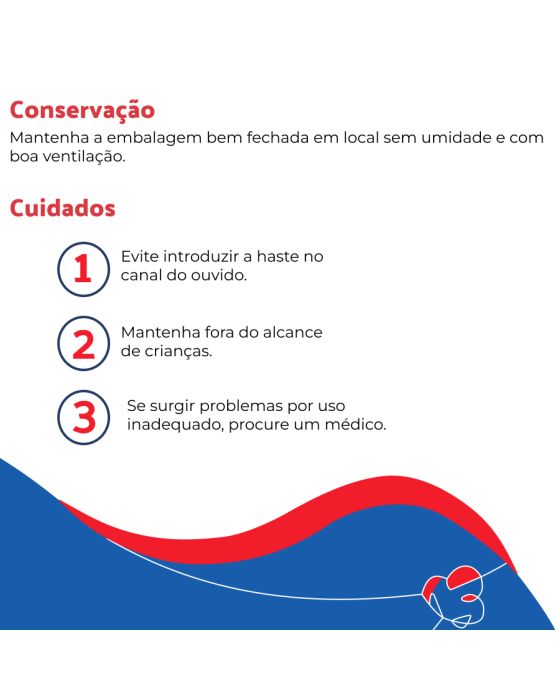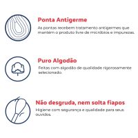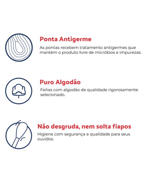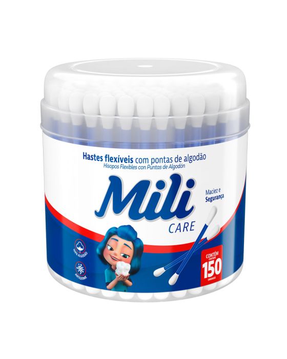Características:São produzidas com tecnologia de ponta e com todos os cuidados os cuidados necessários: utilizado puro algodão tratado com antigerme para garantir uma higiene adequada à saúde e ao bem-estar da sua família!Embalagem com 150 unidades para cuidar de você e de toda a sua família.Detalhes:- Marca: Mili.- Modelo: Mili Care.- Linha: Hastes Flexíveis.- Cor: Corpo azul, com ponta branca.- Contém: 1 embalagem com 150 unidades.- Possui Antigermes.- Não solta fiapos.- Macies e segurança.Conservação:- Mantenha a embalagem bem fechada e em local seco e fresco.Precauções:- Evite introduzir a haste no canal do ouvido.- Mantenha fora do alcance de crianças.- Com o surgimento de problemas por uso inadequado, procure um médico.* As especificações podem ser alteradas sem aviso prévio ** Imagem meramente ilustrativa.