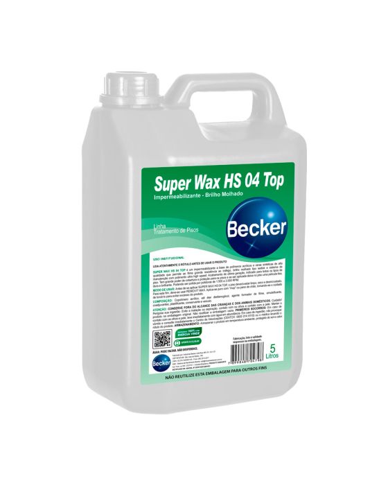 CaracterísticasÉ um impermeabilizante à base de polímeros acrílicos e ceras sintéticas de alta qualidade que permite ao filme grande resistência ao tráfego, brilho molhado tipo wet look e sistema de manutenção com polimento ultra high speed. Acabamento de última geração, indicado para todos os tipos de piso. Tem grande poder de cobertura e proteção para os pisos e ao ser aplicada deixa uma película lisa, dura e brilhante. Podendo ser polida por polidoras de 1500 a 3000 RPM.- Conteúdo: 5L- Fragrância: NeutroEspecificações- Físicas - Aspecto: Líquido - Cor: Branco - pH: 8,0 - 10,0 - Sólidos: 19 - 23%- Químicas - Composição: Copolímero acrílico, etil éter dietilenoglicol, agente formador de filme, emulsificante, coadjuvante, plastificante, conservante e veículo.Campo de aplicação: Formulado para todos os tipos de pisos laváveis em indústrias, escolas, clubes, hospitais, hotéis, cinemas supermercados, etc.Finalidade: Protege os pisos, deixando uma camada dura e resistente sobre os mesmos. Sua moderna formulação proporciona um efeito antiderrapante com eliminação por completo da porosidade do piso. Propicia um brilho molhado tipo WET LOOK.Modos de uso: Antes de aplicar SUPER WAX HS 04, o piso deverá estar limpo, seco e desincrustado. Para este fim, deve-se usar REMOVIT WAX. Aplica-se SUPER WAX HS 04 puro com mop ou pano de chão, tomando-se o cuidado de torcê-los para evitar excesso de produto.* As especificações podem ser alteradas sem aviso prévio** Imagem meramente ilustrativa