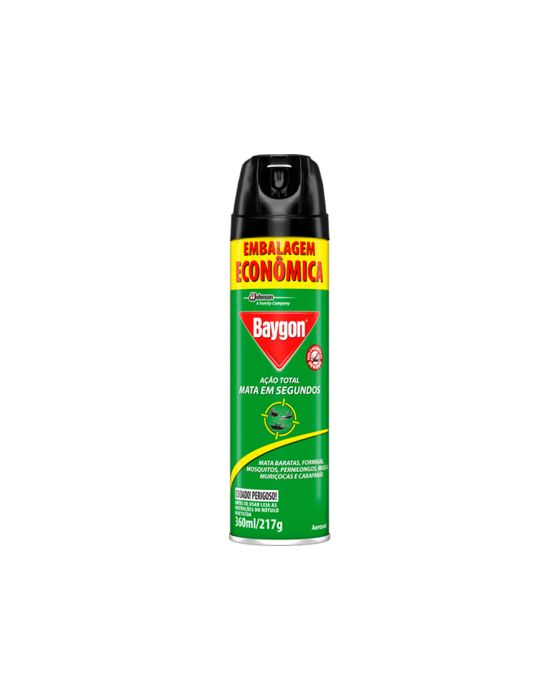Características:Poderoso para resolver seus problemas com insetos, Baygon Ação Total age rapidamente contra baratas e mosquitos/pernilongos, formigas, carapañas, muriçocas e moscas. Mata também o mosquito que pode transmitir a Dengue, o Zika Vírus e a Febre Chikungunya.Detalhes:- Marca: Baygon.- Modelo: Ação Total.- Linha: Inseticida.- Conteúdo: 395 ml.- Peso: 290 gramas.- Sem cheiro.Modo de uso:- Aperte o botão segurando a lata na posição vertical.- Contra baratas e formigas: Aplique o produto diretamente sobre o inseto. - Segure a cerca de 0,5 metro da superfície a ser tratada. - É recomendado verificar a existência de superfícies que podem ser manchadas ou danificadas antes do tratamento completo.- Contra moscas e mosquitos: Fechar o ambiente e pulverizar lentamente por 7 a 9 segundos em todas as direções, para uma área de 10 m². Mantenha o spray a 1 metro de distância de paredes, tecidos e móveis.- Deixar agir por 15 a 20 minutos. Não permanecer na área tratada.- Ventile o ambiente antes de retornar.- Para uma ação rápida, pode-se aplicar o produto diretamente sobre o inseto, mantendo pelo menos 1 metro de distância de paredes, tecidos e móveis.Composição:- Praletrina 0.03%, Cipermetrina 0.1%, Imiprotrina 0.03%, Solventes, Propelentes.AGITE ANTES DE USAR. * As especificações podem ser alteradas sem aviso prévio ** Imagem meramente ilustrativa.