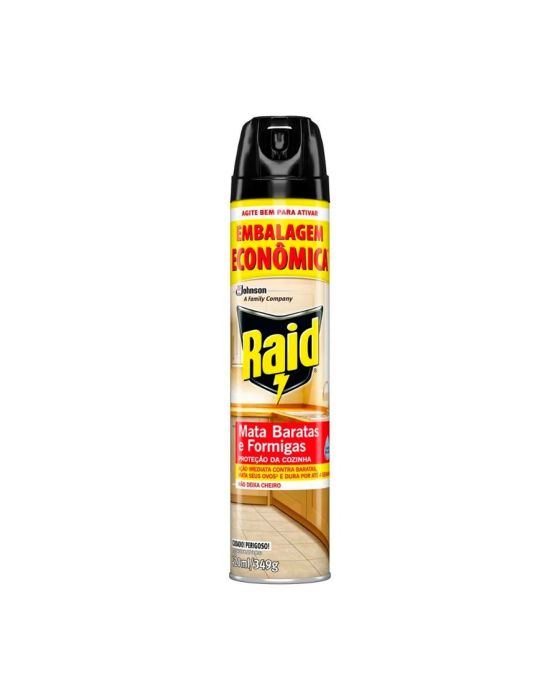 Caracteristicas:Raid® Mata Baratas e Formigas age imediatamente e conta com uma ação residual que dura até quatro semanas, matando inclusive os ovos que as baratas carregam.- Mata: Formigas e Baratas- Contém 420ml/349g- Não deixa cheiroModo de usar1. Agite bem antes de usar.2. Posicione o spray na direção da superfície a ser tratada, mantendo uma distância de 0,50 m (50 cm), pressionando o botão firmemente até que a superfície fique molhada.3. Saia da área tratada e não permita a entrada de pessoas ou animais de estimação. Retorne somente quando a área estiver seca.4. Para garantir uma ação mais rápida, aplique diretamente no inseto.5. Para manter o controle de áreas internas, reaplique o produto a cada 4 semanas. Repita a aplicação se necessário.- CONTRA BARATAS: Aplique em frestas/rachaduras, ao redor de rodapés e outros esconderijos até que a superfície fique molhada.- CONTRA FORMIGAS: Aplique nas trilhas de formigas, perto de portas e janelas e nos locais que as formigas usam para entrar na casa.* As especificações podem ser alteradas sem aviso prévio ** Imagem meramente ilustrativa.