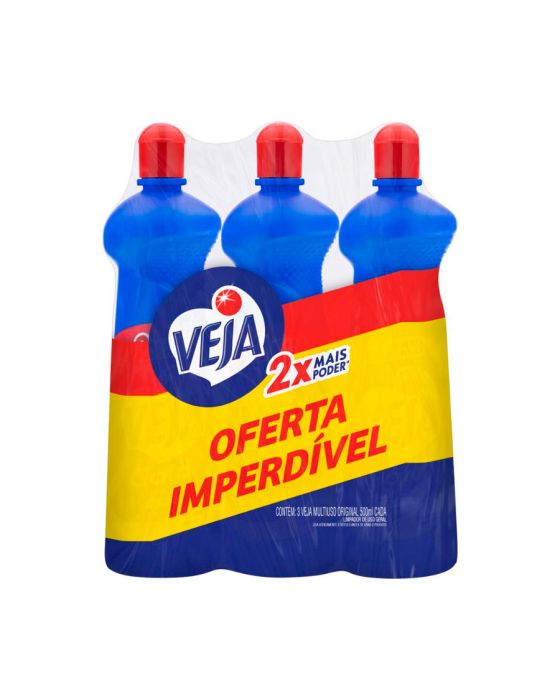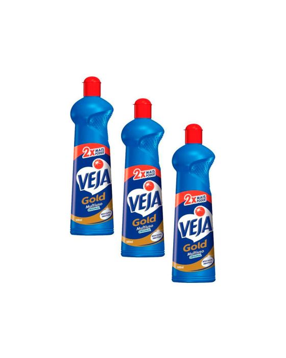 Caracteristicas:O Veja Multiuso é ideal para a limpeza do dia a dia para as sujeiras da casa toda. Veja Gold Possui 2X mais poder, além de resultados imbativeis em multissuperfíceis e multisujeiras.Detalhes:- Volume: 500ml- Marca: Veja- Kit com 3 unidades- Dimensões do produto: 26 x 6.7 x 27 cm- Conteúdo: Líquido- Fragrância: OriginalRecomendação:- Aplique em uma pequena área antes de usarModo de usar:-Aplique o produto nas superfícies desejadas a serem limpas e em seguida passe um pano ou espuma macia para sujeiras mais díficeis-Deixe o produto agir por alguns instantesIndicado para:- Pode ser utilizado em diversos tipos de superfíceis como: Azulejos, Esmaltados, Paredes, Vidro, Inox, Cerâmica, Espelho, Plásticos, Acrílicos, Metais, Ladrilhos, Pisos e Superfícies Laváveis- Capaz de remover muitos tipos de sujeiras como: Fuligem, Gordura da Cozinha, Óleo, Poeira, Batom, Base facial, Lápis, Molho de tomate, Café, Caneta hidrocor, Caneta permanente, Graxa, Marca de dedosPrecaução:- Conserve fora do alcance das crianças e de animais doméstcos- Em caso de ingestão acidental procure imediatamente o centro de intoxicações ou um médico.- Em contato com os olhos lave com água em abundância- Evite contato prolongado com a pele- Evite inalação ou aspiração- Mantenha em lugar arejado e mantenha em embalagem original e fechadaComposição: - Alquil benzeno sulfonato de sódio, lauramina óxida, alcalinizante, coadjuvantes, conservante, agentes de controle de ph, fragrâncias, águaLote e data de fabricação impressos na embalagem * As especificações podem ser alteradas sem aviso prévio ** Imagem meramente ilustrativa