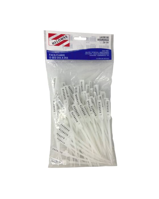 Características:Lacre de segurança em nylon Helomax, com perfeito acabamento e alta tecnologia facilitando o seu dia a dia com segurança para seus produtos, documentos etc.Detalhes:- Marca: Helomax.- Linha: Lacre de Segurança.- Cor: Branco.- Contém: 1 pacote com 100 unidades.- Comprimento do lacre: 16cm.- Medidas embalagem: 15 x 23,5 x 1cm (CxLxA).- Peso com Embalagem: 100g.- Lacre Modelo Escadinha: travamento único.- Lacre com Numeração Sequencial de 7 dígitos.Ideal para:- Malotes, Malas de viagem, Computadores, Caixas, Produtos de Laticínios, Extintores, Identificações, Containers, Caixas de supermercados, Caminhões, Equipamentoss e etc.Comosição:- Confeccionado em Nylon.* As especificações podem ser alteradas sem aviso prévio ** Imagem meramente ilustrativa.