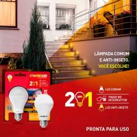 CaracterísticasLâmpada com duas funções, luz branca e anti-inseto. Ao ligar a lâmpada uma primeira vez a luz será branca (6500K), ao desligar e ligá-la uma segunda vez, ela entrará em sua função anti-inseto, tendo sua luz na temperatura de cor de 1900K, com uma característica diferenciada na emissão de luz, que não atrai os insetos.- A funcionalidade da lâmpada não se perde ao ser ligada em série (mais de 1 lâmpada no mesmo circuito)- Proteção e bem estar para sua família através do controle da iluminação inibindo a aproximação de insetos- Indicado para uso em varandas, sacadas, salas e quartos- Lâmpada LED com baixo consumo de energia e pronta para uso sem necessidade de instalar nenhum equipamento auxiliar- A lâmpada inteligente 2x1 é um produto exclusivo que permite a troca da luz branca para luz anti-inseto através de toques no interruptor- São 2 produtos em um, luz branca e luz anti-inseto com tonalidade amarelada sem perder o conforto do ambienteEspecificações- Tensão elétrica: 127/220V Multitensão- Potência: 9W- Fator de potência: >0,7- Formato do corpo: Bulbo A60- Base de conexão: E27- Fluxo Luz: 810lm- Lâmpada fluorescente equivalente: 16W- Lâmpada incandescente equivalente: 60W- Lâmpada halógena equivalente: 50W- Eficiência: 100lm/W- Temperatura de cor: 6500K (branca fria) / 1900K (anti-inseto)- IRC mínimo: 80- Feixe: 220 graus- Cor de acabamento: Branco- Vida: 25.000 horas- Dimerização: Não compatível- Temperatura ambiente de operação: -10°C a 40°C- Grau de proteção: IP20- Composição: Lâmpada: polímero termoplástico, metal e componentes eletrônicos.- Dimensões (AxLxC): 6 x 6 x 11cm- Conteúdo da embalagem: 1 lâmpada* As especificações podem ser alteradas sem aviso prévio ** Imagem meramente ilustrativa.