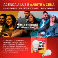 CaracterísticasProporcione o bem estar da sua família escolhendo a cor da luz através do interruptor mantendo o conforto visual das pessoas.- Lâmpada LED com baixo consumo de energia e pronta para uso sem necessidade de instalar nenhum equipamento auxiliar- A lâmpada inteligente 3 tons de branco é um produto exclusivo que permite a trocar o tom da luz com simples toques no interruptor- São 3 produtos em um, luz branca, luz neutra e luz amarela, escolha o que mais lhe agrada e transforme seu ambiente- Indicado para uso em salas, quartos, escritório- O produto, ao ser ligado uma primeira vez, acenderá com a temperatura de cor 6500K, após desligar e ligar novamente, a temperatura de cor será de 4000K e, por fim, após desligar e ligar novamente, a temperatura de cor será 2700K. O ciclo se repete depois de ter passado as três opções.- A funcionalidade da lâmpada não se perde ao ser ligada em série (mais de 1 lâmpada no mesmo circuito)Especificações- Tensão: 127V/220V Multitensão- Potência: 9W- Fator de potência: >0,7- Formato do corpo: Bulbo A60- Base de conexão: E27- Fluxo de luz: 760 lm- Lâmpada fluorescente equivalente: 15W- Lâmpada incandescente equivalente: 50W- Lâmpada halógena equivalente: 50W- Eficiência: 100 lm/W- Temperatura de cor: 6500K/4000K/2700K (Branca Fria/Neutra/Quente)- IRC mínimo: 80- Feixe: 180 graus- Cor acabamento: Branca- Vida útil: 25.000 horas- Temperatura ambiente de operação: -10°C a 40°C- Grau de proteção: IP20- Composição: Lâmpada: polímero termoplástico, metal e componentes eletrônicos.- Dimensões (AxLxC): 6 x 6 x 11,2cm- Conteúdo da embalagem: 1 lâmpada* As especificações podem ser alteradas sem aviso prévio ** Imagem meramente ilustrativa.