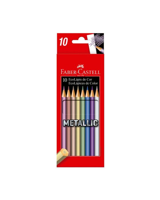 Caracteristicas:Com o Lápis de Cor EcoLápis Metallic Faber-Castell é possível pintar sobre papeis brancos e escuros!Detalhes:- Marca: Faber-Castell.- Modelo: 120410G.- Linha: Lápis de cor Ecolápis Metallic.- Cores: 10 cores metálicas.- Efeitos brilhantes, principalmente sobre papeis escuros- Formato hexagonal- Ponta Max resistente.- Produzido com madeira 100% reflorestada- Produto certificado FSC.* As especificações podem ser alteradas sem aviso prévio ** Imagem meramente ilustrativa.