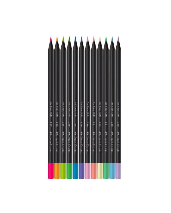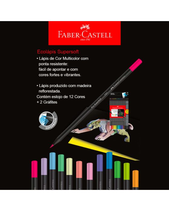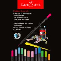 Caracteristicas: O EcoLápis de Cor Super Soft possui fórmula especial que proporciona muito mais conforto ao colorir e tem ótima cobertura tanto em papéis claros quanto escuros. Além disso, possui acabamento em madeira preta!Detalhes:- Marca: Faber-Castell.- Modelo: 120712SOFT+2.- Linha: Ecolápis SuperSoft.- Formato: Redondo.- Cores: 12 cores.- Excelente cobertura sobre papéis claros e escuros- Cores mais vivas- Mina supermacia- Conteúdo da embalagem: 1 estojo com 12 unidades de lápis de cor SuperSoft + 2 lápis ecolápis grafite.- Embalagem reutilizável e 100% reciclável- Produto certificado FSC.* As especificações podem ser alteradas sem aviso prévio ** Imagem meramente ilustrativa.