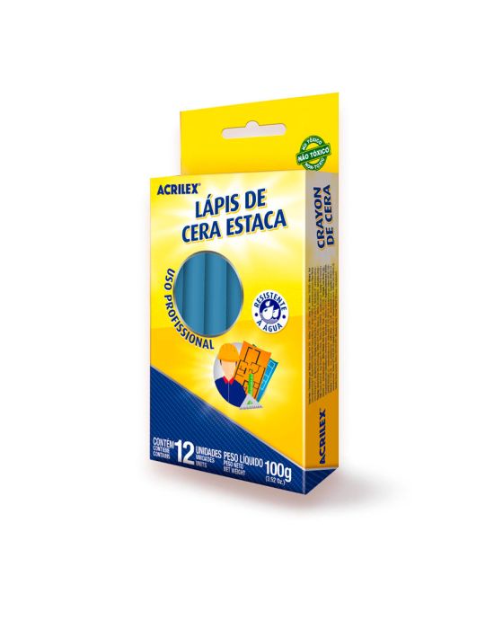 Caracteristicas:- Marca: Acrilex.- Modelo: 09110.- Linha: Lápis de Cera Estaca.- Cor: Azul.- Contém: 1 caixa com 12 unidades do produto.- Fabricado com ceras de alta qualidade - Proporciona cobertura e traços de grandes áreas sem esforço - Não tóxico - Não mancha as mãos.- Uso Macio.- Uso Profissional.- Traço Macio.Onde usar:- Ideal para para marcar a madeira, couro, borracha, cimento, mármore e granito, etc. Composição:- Ceras, Cargas Minerais Inertes e Pigmentos.Conservação:- Evite a exposição direta aos raios solares e temperaturas acima de 45°C, pois o produto pode sofrer alterações.- Armazenar em local seco e ventilado.- Frágil, evite quedas e choques.* As especificações podem ser alteradas sem aviso prévio ** Imagem meramente ilustrativa.