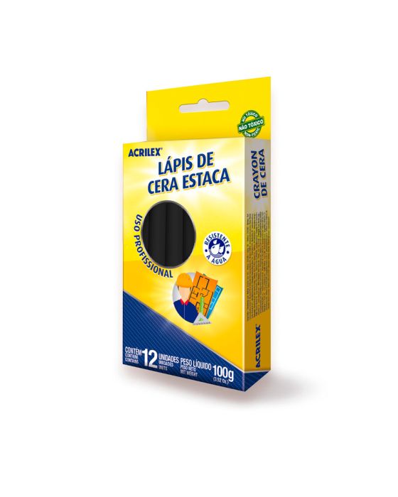 Caracteristicas:- Marca: Acrilex.- Modelo: 09110.- Linha: Lápis de Cera Estaca.- Cor: Preto.- Contém: 1 caixa com 12 unidades do produto.- Fabricado com ceras de alta qualidade - Proporciona cobertura e traços de grandes áreas sem esforço - Não tóxico - Não mancha as mãos.- Uso Macio.- Uso Profissional.- Traço Macio.Onde usar:- Ideal para para marcar a madeira, couro, borracha, cimento, mármore e granito, etc. Composição:- Ceras, Cargas Minerais Inertes e Pigmentos.Conservação:- Evite a exposição direta aos raios solares e temperaturas acima de 45°C, pois o produto pode sofrer alterações.- Armazenar em local seco e ventilado.- Frágil, evite quedas e choques.* As especificações podem ser alteradas sem aviso prévio ** Imagem meramente ilustrativa.