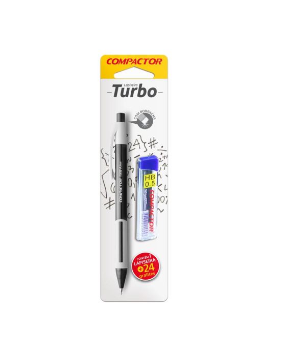 Caracteristicas:- Pega emborrachada para maior conforto- Chegou a nova Lapiseira Turbo Compactor com muito mais design para você fazer bonito na escola ou no escritório- Nas cores azul ou preta, essa lapiseira possui pega emborrachada para maior conforto das mãos e um corpo altamente resistente, preciso e leve. - Vem acompanhada de borracha na parte traseira.- Blister com 1 lapiseira + 1 tubo com 24 minas de grafite* As especificações podem ser alteradas sem aviso prévio ** Imagem meramente ilustrativa