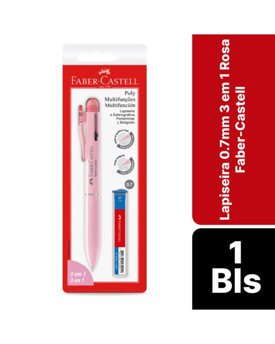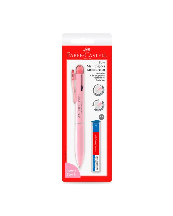 Características:Chegou a combinação que faltava! A Poly Multifunção é a junção de lapiseira 0.7mm com duas cores de caneta semi-gel azul e preta, com corpo rosa.Detalhes:- Marca: Faber-Castell;- Modelo: Poly Multifunções 3 em 1;- Referência: SM/07L31RS;- Linha: Caneta Lapiseira;- Cor: Rosa;- Graduação: 0.7mm;- Contém: 1 Blister com duas unidades do produto;- Acompanha: 1 estojo de grafite 0.7mm B;- Esferográfica com tinta semi-gel azul e preta para maior fluidez e maciez;- Lapiseira 0.7 mm;- Borracha na ponta com tampa;- Versatilidade e possibilidades reunidas;- Produto atóxico.Fabricado na China. | Validade: Indeterminada.Modo de uso:- Acione a caneta azul puxando o dispositivo azul para baixo;- Acione e caneta preta puxando o dispositivo preto para baixo;- Acione a lapiseira ao empurrar o clip para baixo;- Para adicionar o grafite, pressione repetidamente o clip para baixo.Composição:- Resinas termoplásticas, ponta metálica, mola de aço inox, mina Polymer e borracha sintética.Conservação:- Evitar temperaturas acima de 45°C e exposição direta aos raios solares;- Armazenar em local seco e ventilado.Medidas:- Dimensões da embalagem: 20,9 x 6,6 x 1,5m (CxLxA);- Peso: 23g.ATENÇÃO! NÃO RECOMENDÁVEL PARA CRIANÇAS MENORES DE 3 (TRÊS) ANOS POR CONTER PARTE(S) PEQUENA(S) QUE PODE(M) SER ENGOLIDA(S) OU ASPIRADA(S) E PONTA(S) AGUDA(S) FUNCIONAL(IS). CRIANÇAS ENTRE 5 (CINCO) E 8 (OITO) ANOS SOMENTE DEVEM UTILIZAR SOBR SUPERVISÃO DE UM ADULTO.* As especificações podem ser alteradas sem aviso prévio ** Imagem meramente ilustrativa.