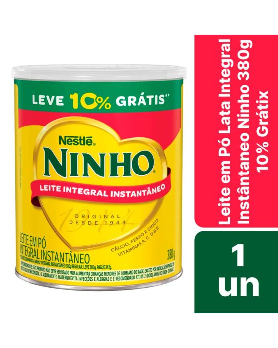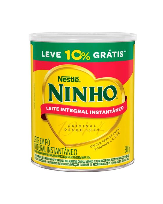 Característica:Você pediu, e Ninho® Leite Integral Instantâneo voltou por ser Instantâneo, dissolve fácil em água quente ou fria! Ninho® Leite Integral Instantâneo é Rico em Cálcio e Fonte de Ferro, Zinco e Vitaminas A, C, D & E, além de toda a cremosidade e o sabor irresistível que só Leite Ninho® tem!Detalhes:- Marca: Leite Ninho®;- Tipo: Lata;- Sabor: Integral;- Peso: 380g;- Rendimento: 15 copos;- Contém: 1 unidade do produto;- Embalagem promocional: Leve 10% grátis;- Fácil em água quente ou fria;- Marca número 1 da família brasileira;- Feito com todo cuidado, e passa por centenas de análises de qualidade.Indústria Brasileira.Modo de preparo:- 1 Copo de 300ml: em um copo com água morna e fria (180ml), coloque 2 colheres de sopa (25g) de Ninho Integral Instantâneo e misture bem;- Utilize somente água fria e fervida ou filtrada.Ingredientes:- Ingredientes: leite integral, minerais [cálcio (carbonato de cálcio), ferro (pirofosfato férrico) e zinco (sulfato de zinco)], vitaminas [(vitamina C (L-ascorbato de sódio), vitamina E (acetato de DL-alfa-tocoferila), vitamina A (acetato de retinila) e vitamina D (colecalciferol)] e emulsificante lecitina.Armazenagem:- Guardar a lata bem tampada em lugar seco e fresco; - Após abertura da lata o produto conserva-se bom para o consumo até o prazo máximo de 30 dias.Recicle:- Se você tem acesso a coleta seletiva, descarte junto aos materiais recicláveis.- Caso não tenha, encontre o ponto de entrega mais próximo de você: https://www.nescafe-dolcegusto.com.br/sustentabilidadendgALÉRGICOS: CONTÉM LEITE E DERIVADIS DE SOJA.CONTÉM LACTOSE. CONTÉM GLÚTEN.AVISO IMPORTANTE: ESTE PRODUTO NÃO DEVE SER USADO PARA ALIMENTAR CRIANÇAS MENORES DE 1 (UM) ANO DE IDADE, EXCETO POR INDICAÇÃO EXPRESSA DE MÉDICO OU NUTRICIONISTA. O ALEITAMENTO MATERNO EVITA INFECÇÕES E ALERGIAS E É RECOMENDADO ATÉ OS 2 (DOIS) ANOS DE IDADE OU MAIS.* As especificações podem ser alteradas sem aviso prévio ** Imagem meramente ilustrativa.