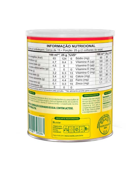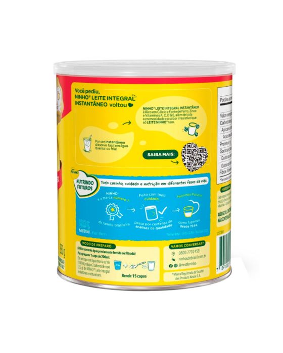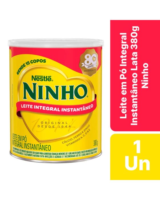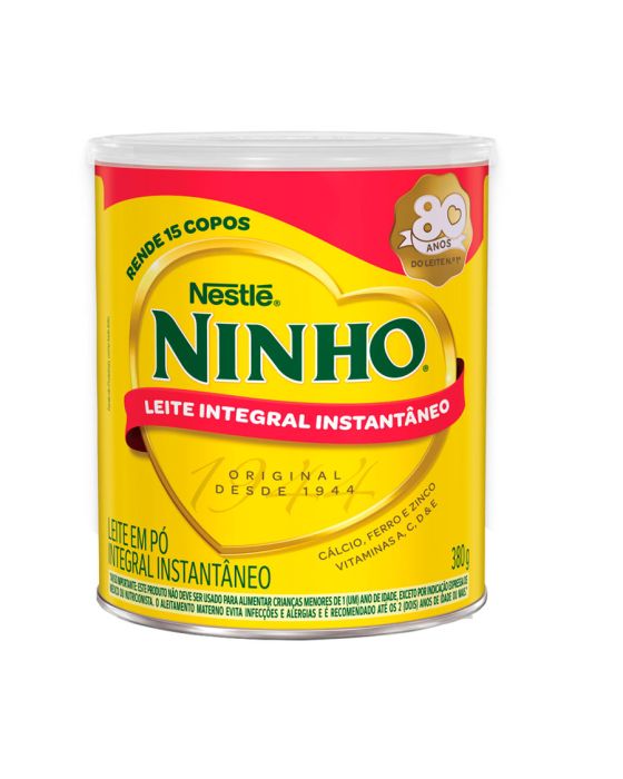 Característica:Você pediu, Ninho® Leite Integral Instantâneo voltou Por ser Instantâneo, dissolve fácil em água quente ou fria! Ninho® Leite Integral Instantâneo é Rico em Cálcio e Fonte de Ferro, Zinco e Vitaminas A, C, D & E, além de toda a cremosidade e o sabor irresistível que só Leite Ninho® tem.Detalhes:- Marca: Ninho®;- Tipo: Lata;- Sabor: Integral;- Peso: 380g;- Rendimento: 15 copos;- Contém: 1 unidade do produto;- Nova fórmula;- Cálcio, ferro e zinco (vitaminas A, C, D e E);- Fácil em água quente ou fria;- Marca número 1 da família brasileira;- Feito com todo cuidado, e passa por centenas de análises de qualidade;- Original desde 1994.Indústria Brasileira.Modo de preparo:- 1 Copo de 200ml: em um copo com água morna e fria (180ml), coloque 2 colheres de sopa (25g) de Ninho Integral Instantâneo e misture bem;- Utilize somente água previamente fervida ou filtrada.Ingredientes:- Leite Integral, [Cálcio (carbonato de cálcio), ferro (pirofosfato férrico) e zinco (sulfato de zinco)], vitaminas [(vitamina C (L-ascorbato de sódio), vitamina E (acetato de DL-alfa-tocoferila), vitamina A (acetato de retinila) e vitamina D (colecalciferol)] e emulsificante lecitina.Armazenagem:- Guardar a lata bem tampada em lugar seco e fresco;- Após abertura da lata o produto conserva-se bom para o consumo até o prazo máximo de 30 dias.Medidas:- Dimensões do produto: 10 x 10 x 11,8 (CxLxA);- Peso: 380g.ALÉRGICOS: CONTÉM LEITE E DERIVADOS DE SOJA.CONTÉM LACTOSE. NÃO CONTÉM GLÚTEN.AVISO IMPORTANTE: ESTE PRODUTO NÃO DEVE SER USADO PARA ALIMENTAR CRIANÇAS MENORES DE 1 (UM) ANO DE IDADE, EXCETO POR INDICAÇÃO EXPRESSA DE MÉDICO OU NUTRICIONISTA. O ALEITAMENTO MATERNO EVITA INFECÇÕES E ALERGIAS E É RECOMENDADO ATÉ OS 2 (DOIS) ANOS DE IDADE OU MAIS.* As especificações podem ser alteradas sem aviso prévio ** Imagem meramente ilustrativa.