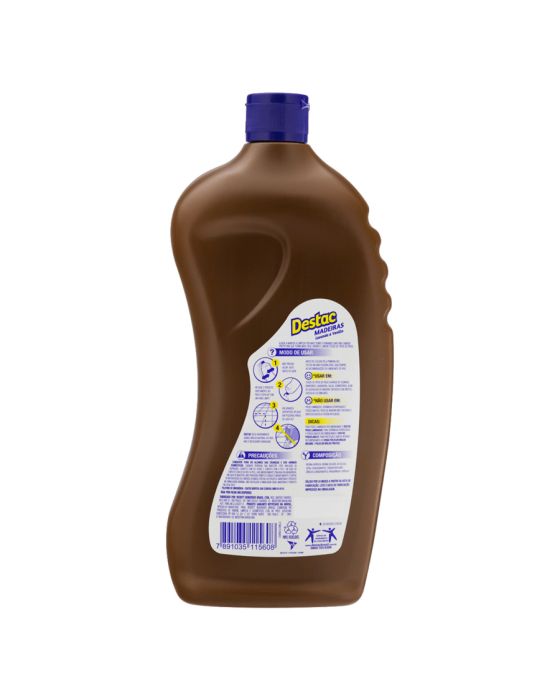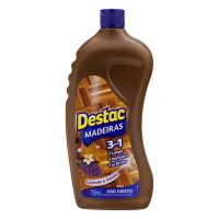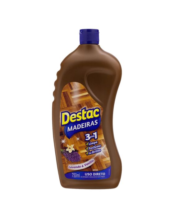 Caracteristicas:Limpador para Pisos de Madeira Lavanda & Vanilla é feito para todos os tipos de pisos laváveis de cozinhas, banheiros, lavanderia, salas, dormitórios como também de assoalhos de madeira tratados com sinteco, cascolac e similares.Detalhes: - Marca: Destac;- Fabricante: Reckitt;- Modelo: Limpa madeiras;- Quantidade: 750ml;- Contém: 1 unidade do produto;- Fragrância: Lavanda e Vanilla;- Uso direto. Ingredientes:Resina acrílica, resina solúvel ao álcali, cera, coadjuvantes, tensoativos não-iônicos, conservantes, fragrância e veículo.Modo de usar:- Agite antes de usar;- Aplique diretamente o piso e espalhe com um pano úmido;- Em grandes superfícies aplique em pequenas áreas de cada vez;- Seca rapidamente dando brilho natural ao piso, não é necessário enxaguar.Teste em uma área para utilizar uma primeira vez. Siga sempre as informações do fabricante.Recomendações: - Usar em: todos os pisos laváveis como Cozinhas, Banheiros, Lavanderia, Salas, Dormitórios, álem de assoalhos de madeira tratados com sinteco, Casolac e afins.- Não usar em: Pisos Laminados, Cerâmicas Vitrificadas e porcelanatos (estes já possuem produto próprio)* As especificações podem ser alteradas sem aviso prévio ** Imagem meramente ilustrativa.