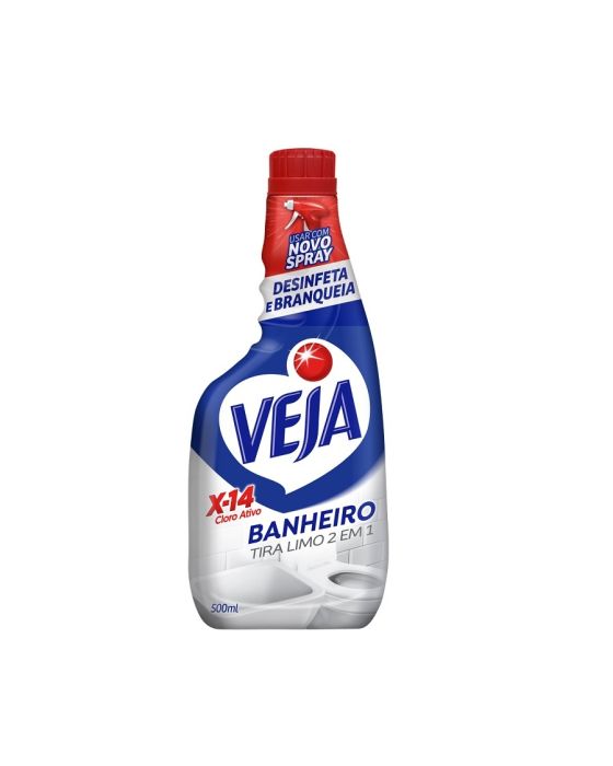 Caracteristicas: Veja Banheiro X-14 2 em 1 Tira Limo Cloro Ativo com espumação limpa e remove as sujeiras mais difícies diante dos seus olhos.- Superfícies: Box, Pisos e azulejos, vaso sanitário, pias de banheiro, banheiras.- Sujeiras: Gordura do Banheiro, Limo, Marcas de Dedos.- Beneficios: Ação Desinfetante, Limpeza Profunda- Apresentação: Refil para o Pulverizador- Conteúdo: 500ML * As especificações podem ser alteradas sem aviso prévio ** Imagem meramente ilustrativa
