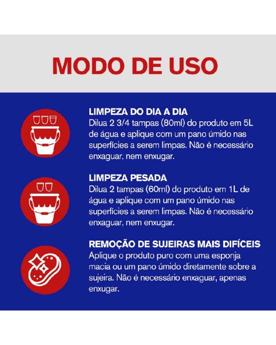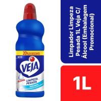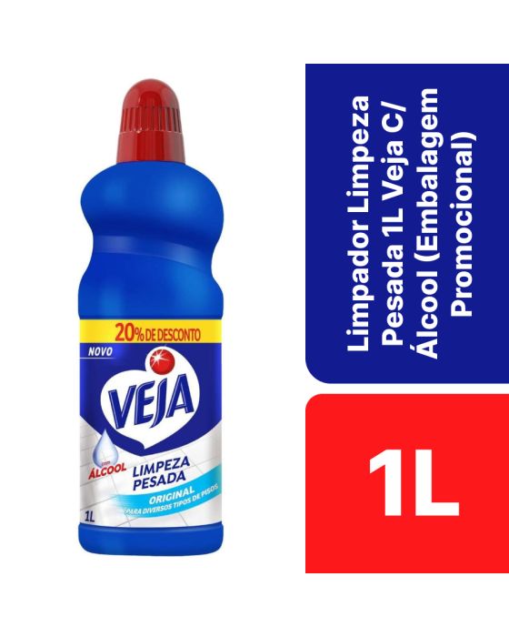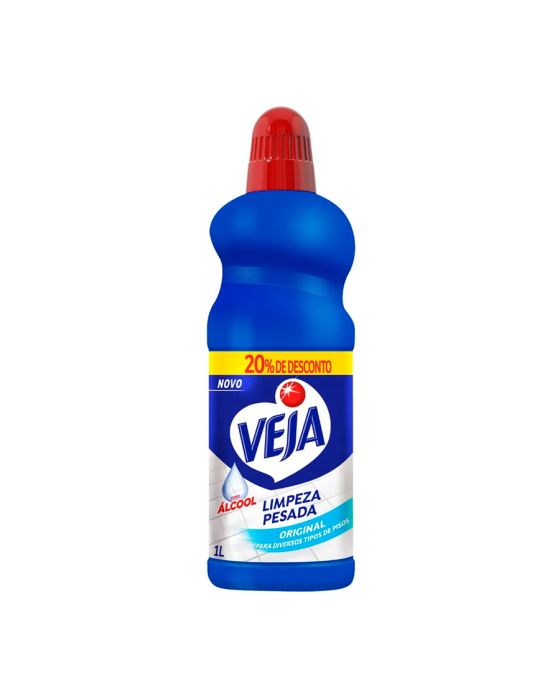 Características:O novo Veja® Limpeza Pesada Original possui exclusiva fórmula com álcool e remove até as sujeiras mais difíceis, garantindo máxima limpeza para diversos pisos.Detalhes:- Marca: Veja;- Modelo: Limpeza Pesada;- Linha: Limpadores;- Fragrância: Original;- Volume: 1 litro;- Contém: 1 unidade do produto com 1 litro;- 20% de desconto (Embalagem Promocional);- Com Álcool;- Original, para diversos tipos de pisos;- Rende até 62 litros.Superfícies Recomendadas:- É recomendado para limpeza de diversos tipos de pisos laváveis da sua casa, tais como cerâmica, porcelanato, granito e ardósia.Modo de uso:- Limpeza do dia a dia: Dilua 2¾ tampas (80ml) do produto em 5L de água e aplique com um pano úmido nas superfícies a serem limpas. Não é necessário enxáguar, nem enxugar;- Limpeza pesada: Dilua 2 tampas (60ml) do produto em 1l de água, aplique com um pano úmido nas superfícies a serem limpas. Não é necessário enxaguar, nem enxugar;- Remoção de sujeiras mais difíceis: Aplique o produto puro com uma esponja macia ou um pano úmido diretamente sobre a sujeira. Não é preciso enxaguar, apenas enxugar.Composição:- Ingrediente Ativo, Alquilbenzeno Sulfonato de Sódio, Lauril Éter Sulfonato de Sódio, Acidificante, Sequestrante, Fragrância, Branqueador Óptico, Coadjuvantes, Solvente e Água.ATENÇÃO! CONSERVE FORA DO ALCANCE DAS CRIANÇAS E DOS ANIMAIS DOMÉSTICOS.* As especificações podem ser alteradas sem aviso prévio ** Imagem meramente ilustrativa.