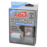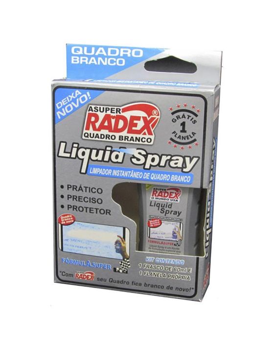 Caracteristicas: - Liquid Spray é um líquido especial especialmente formulado para remover instataneamente manchas, residuos e sujeiras, deixadas por marcadores em geral em seu quadro branco, deixando o quadro branco sempre limpo e renovado para o uso, - 60 ML de produto - Acompanha uma flanela. - Marca: Radex - Composição: Etanol hidratado, isopropanol, veículo e bensoato de denatonio. * As especificações podem ser alteradas sem aviso prévio ** Imagem meramente ilustrativa