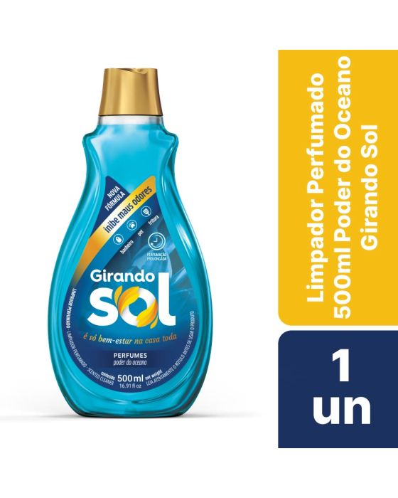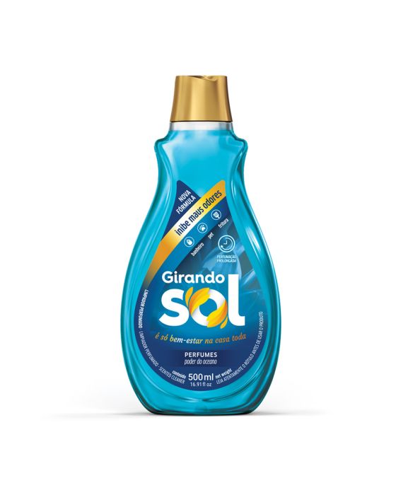 Características:O Limpador Perfumado Girando Sol combina agentes de limpeza com fragrâncias de perfumaria fina e inspiradas na natureza. Suas moléculas de perfumação inibem os maus odores de banheiros, pets e frituras, deixando o ambiente com uma sensação de limpeza e bem-estar. Ideal para a limpeza de todas as superfícies laváveis da casa.Detalhes:- Marca: Girando Sol;- Modelo: Poder do Oceano;- Linha: Limpador Perfumado;- Volume: 500ml;- Fragrância: Poder do Oceano;- Cor do líquido: Azul;- Contém: 1 unidade do produto;- Inibe maus odores;- Limpeza + Perfumação;- Para banheiro, pet e fritura;- Perfumação Prolongada;- Água pode faltar, não desperdice.Indústria Brasileira. | Validade: 24 meses após a data de fabricação.Ideal para:- Ideal para limpar superfícies laváveis, como cozinhas, banheiros, bancadas, pisos e azulejos.Modo de uso:- Aplique o limpador perfumado Gorando sol diretamente sobre as superfícies a serem limpas e espalhe com um pano limpo;- Se desejar, dilua o produto em água;- Não é necessário enxaguar.Conservação:- Armazenar em local seco e fresco;- Mantenha a embalagem fechada e em sua embalagem original;- Não ingerir ou inalar.Composição:- Princípios Ativos: Amina Quaternária de Coco Etoxilada e Álcool Etoxilado, Coadjuvantes, Sequestrante, Conservantes, Corante, Fragrância e Água.Medidas:- Dimensões do produto: 9 x 5,2 x 21,6cm (CxLxA);MANTENHA FORA DO ALCANCE DAS CRIANÇAS E DOS ANIMAIS DOMÉSTICOS.* As especificações podem ser alteradas sem aviso prévio ** Imagem meramente ilustrativa.