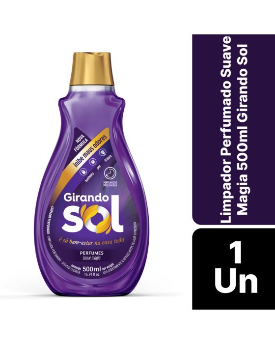 Características:O Limpador Perfumado Girando Sol combina agentes de limpeza com fragrâncias de perfumaria fina e inspiradas na natureza. Suas moléculas de perfumação inibem os maus odores de banheiros, pets e frituras, deixando na casa ou escritório uma sensação de limpeza e bem-estar!Detalhes:- Marca: Girando Sol;- Linha: Limpadores Perfumado;- Tipo: Uso direto/Diluição;- Fragrância: Suave Magia;- Volume/Peso: 500ml;- Contém: 1 unidade do produto com 500ml;- Perfumação prolongada;- Limpeza + Perfumação;- Inibe maus odores;- Ideal para diversos tipos de ambientes;- Produto não testado em animais;- Embalagem reciclável;- Água pode faltar, não desperdice.Indústria Brasileira. | Validade: Válido por 24 meses após a data de fabricação impressa na embalagem.Ideal para:- Ideal para a limpeza de todas as superfícies laváveis da casa.Modo de uso:- Aplique o limpador perfumado Girando Sol diretamente sobre as superfícies a serem limpas e espalhe com um pano limpo;- Se desejar, dilua o produto em água;- Não é necessário enxaguar.Conservação:- Mantenha o produto fechado após o uso e em sua embalagem original;- Mantenha em lugar seco, fresco, arejado e ao abrigo da luz solar direta;- Não reutilize a embalagem vazia para outros fins;- Não dê nada por via oral a uma pessoa inconsciente.Composição:- Amina Quaternária de Coco Etoxilada e Álcool Etoxilado, Coadjuvantes, Sequestrante, Conservantes, Corantes, Fragrância e Água.Medidas:- Dimensões da embalagem: 9,5 x 5 x 21cm (CxLxA);- Peso: 539g.IMPORTANTE! CONSERVAR FORA DO ALCANCE DE CRIANÇAS E ANIMAIS DOMÉSTICOS.* As especificações podem ser alteradas sem aviso prévio ** Imagem meramente ilustrativa.