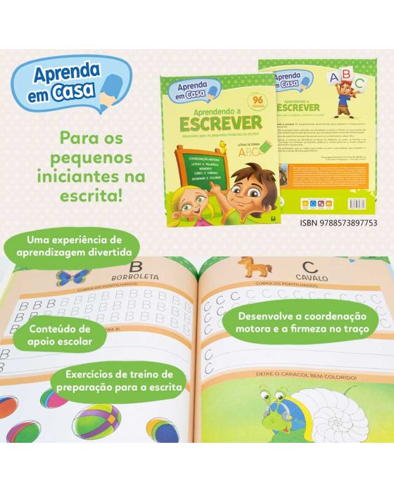 Caracteristicas:Aprendendo a escrever foi especialmente desenvolvida para preparar a criança para o mundo da escrita. Por meio de ilustrações bem coloridas, as atividades auxiliam a firmar os movimentos da mão - um treino básico para o ato de escrever que será aprendido na fase de alfabetização. Os exercícios evoluem de acordo com a faixa etária e os conhecimentos adquiridos. Passo a passo, a criança vai identificar as letras do alfabeto, as cores, as formas e os números. Também vai conhecer as famílias silábicas e várias palavras e, ainda, adquirir noções de tamanho e proporção. Esta é uma publicação que eu indico para pais e educadores que orientam o aprendizado de crianças da Educação Infantil.Rosangela Barbosa Ferreira de Medeiros Orientadora pedagógica - Educação InfantilHabilidades desenvolvidasHABILIDADES DE ESCRITA COORDENAÇÃO MOTORA HABILIDADES COGNITIVASDescrição do Livro-Formato: 20x27 cm -Páginas: 96 -Faixa Etária: De 3 a 5 anos -Acabamento: Brochura, lombada quadrada com laminação fosca e reserva de verniz- * As especificações podem ser alteradas sem aviso prévio ** Imagem meramente ilustrativa