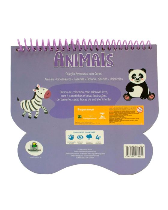 Características:Divirta-se colorindo este adorável livro, com 4 canetinhas e belas ilustrações, serão horas de entretenimento!Detalhes:- Marca: Todolivro;- Modelo: Aventuras com cores;- Coleção: Animais- Referência: 1174673;- Linha: Livros de colorir;- Capa: Capa flexível com laminação fosca e detalhes metalizados;- Quantidade de folhas: 24 folhas- Contém: 1 unidade do produto;- Formato: 21,5 x 19,5cm;- Faixa etária: A partir de 4 anos;- Acompanha: 4 canetinhas para colorir nas cores Verde, Amarelo, Rosa e Lilás;- Possui uma cartela de adesivos de animais;- Diversos desenhos para colorir e treinar coordenação.Habilidades Cognitivas:- Coordenação motora, estímulo visual, expande o imaginário.Medidas:- Dimensões do produto: 21,5 x 20 x 1,1cm (CxLxA).ATENÇÃO! NÃO RECOMENDÁVEL PARA CRIANÇAS MENORES DE 4 (QUATRO) ANOS POR CONTER PARTE(S) PEQUENA(S) QUE PODE(M) SER ENGOLIDA(S) OU ASPIRADA(S).* As especificações podem ser alteradas sem aviso prévio ** Imagem meramente ilustrativa.