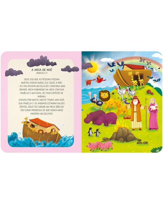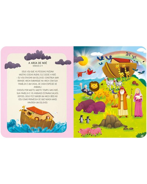Caracteristicas:Esta obra, lindamente ilustrada, traz uma seleção de envolventes histórias da Bíblia. Da criação do mundo até a bonita e cativante história de Jesus e seus ensinamentos eternos.- Torna a leitura um momento de aconchego e amor entre pais e filhos.- Textos curtos e simples.- Estimula, desde cedo, o entendimento das palavras de Deus, a fé, as boas atitudes e a gratidão.- Uma ferramenta relevante para os Educadores cristãos.- Formato Capa Dura- Formato 14,7 x 18,4cm- Páginas 30- Faixa Etária A partir de 3 anos- Acabamento: Cartonado, capa dura almofadada com reserva de verniz* As especificações podem ser alteradas sem aviso prévio ** Imagem meramente ilustrativa