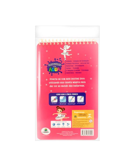 Características:Divirta-se com este incrível livro utilizando sua caneta mágica para dar cor ao mundo das bailarinas.Detalhes:- Marca: Todolivro;- Modelo: Surpresas com Água;- Coleção: Bailarinas;- Referência: 1174665;- Linha: Livros de colorir;- Capa: Capa flexível com laminação fosca;- Quantidade de folhas: 6 folhas- Contém: 1 unidade do produto;- Formato: 14,2 x 24cm;- Faixa etária: A partir de 3 anos;- Acompanha: 1 pincel para água;- Diversos desenhos para colorir e treinar coordenação;- Páginas autosecante;- Pincel reservatório plástico.Como usar o pincel mágico:- Gire a tampa para abrir o pincel;- Mergulhe a abertura na água. Aperte e sorte para encher o pincel;- Tampe o pincel. Para colorir, pressione o pincel levemente nas páginas;- Espere a água secar para colorir novamente.Habilidades Cognitivas:- Coordenação motora, estímulo visual, Desperta a criatividade.Medidas:- Dimensões do produto: 24 x 14,2 x 0,3cm (CxLxA).ATENÇÃO! NÃO RECOMENDÁVEL PARA CRIANÇAS MENORES DE 3 (QUATRO) ANOS POR CONTER PARTE(S) PEQUENA(S) QUE PODE(M) SER ENGOLIDA(S) OU ASPIRADA(S).* As especificações podem ser alteradas sem aviso prévio ** Imagem meramente ilustrativa.