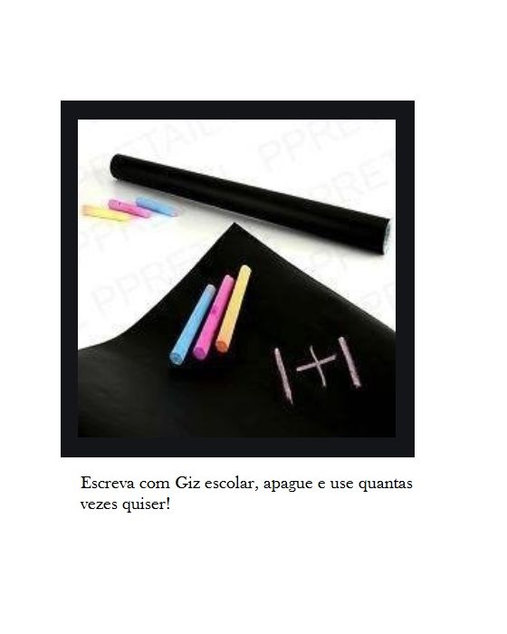 Caracteristica:Tendência em decorações de cozinha, quartos infantis e halls de entrada, a lousa deixou o ambiente sala de aula para trás e se tornou uma escolha simples, criativa e cheia de personalidade para ambientes internos.E quem procura uma opção de fácil aplicação e limpeza, personalização e acabamento de primeira, o plástico autoadesivo de lousa garante tudo isso e mais. Já com 1 giz branco incluso, é só colar e usar.- É um laminado de PVC autoadesivo, protegido, no verso, por papel siliconado- 60 micras - Medidas: 45cm x 2,5m - Cor: Preta- Pode ser utilizado o giz tradicional ou giz líquido- Fabricante: PlavitecBuscando inspiração para personalizar seu home office, sua casa ou seu escritório usando a lousa adesiva? Conferira essas imagens que separamos para você: https://pin.it/6aWXdOc * As especificações podem ser alteradas sem aviso prévio ** Imagem meramente ilustrativa